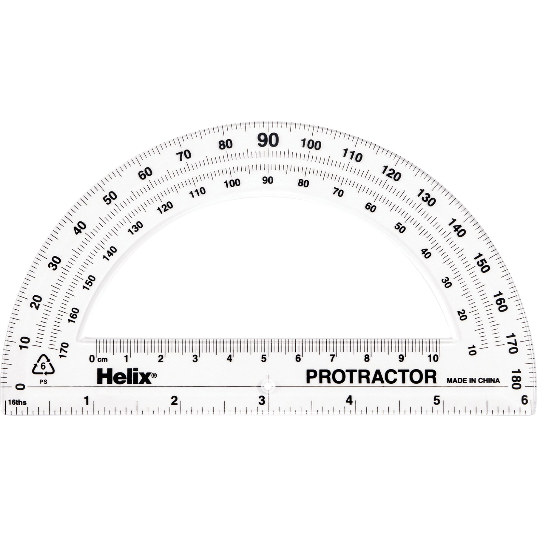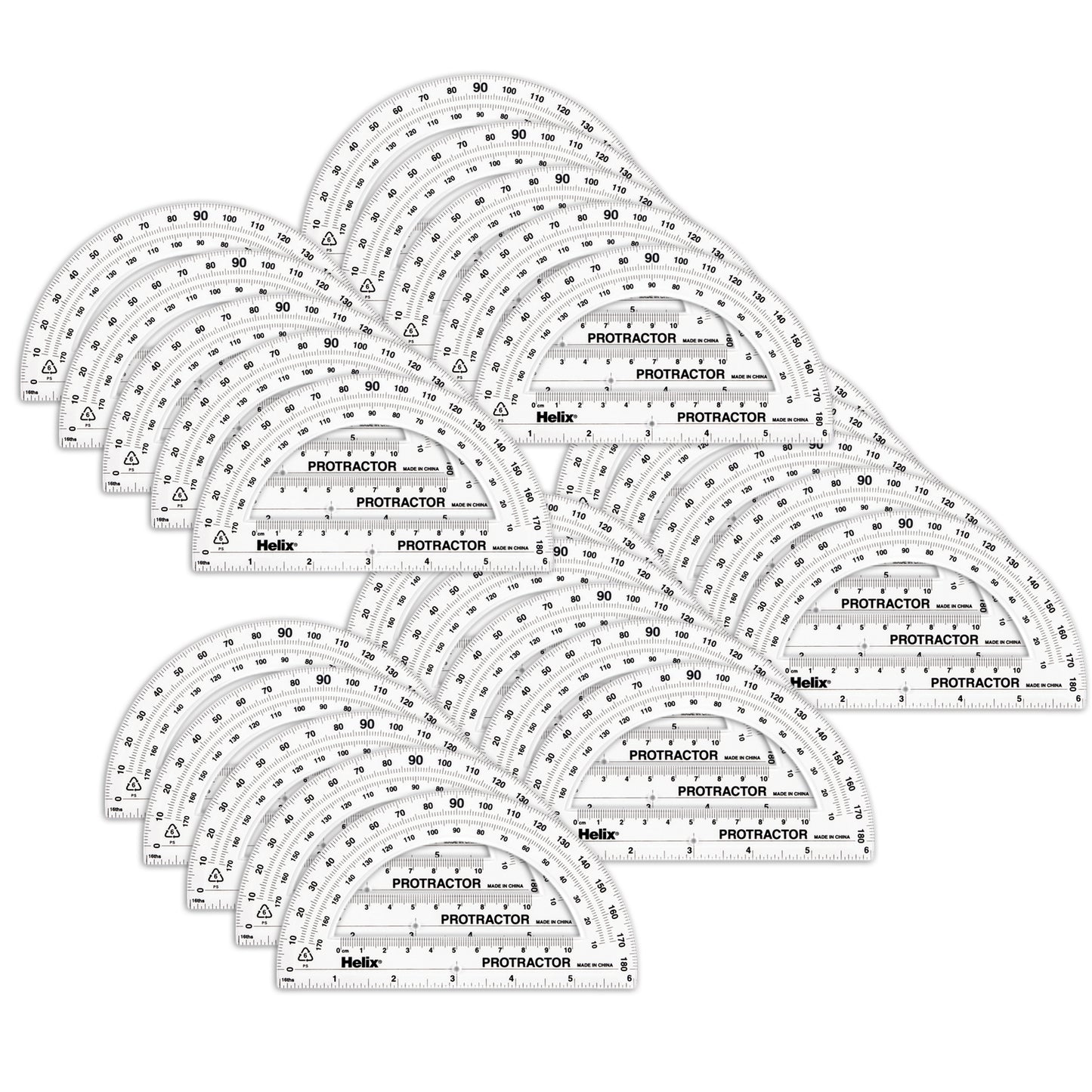 The classic school protractor! This 180 degree protractor is made of crystal clear plastic construction so you can easily see the angle you're drawing, and features 6" and 10cm rulers for easy measuring. Integrated centering hole is easy to set at the angle start point, and the angle graduations allow you to measure angles right to left or left to right. Protractor edge features beveled edges for clean, accurate lines! Sold as a pack of 25 protractors.