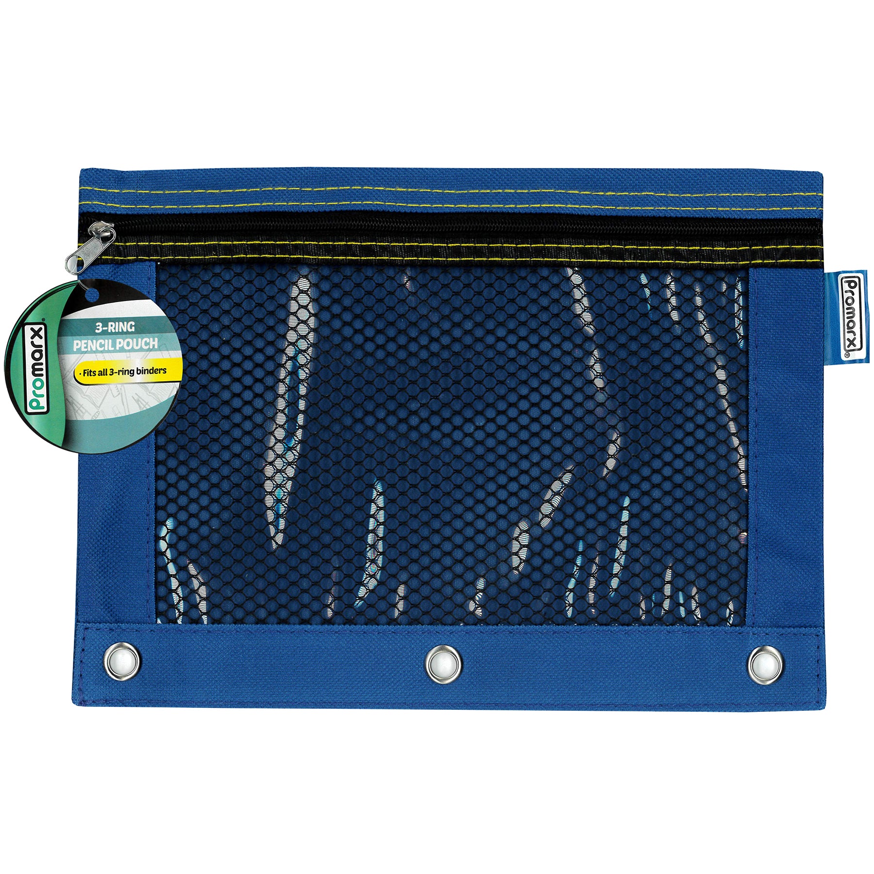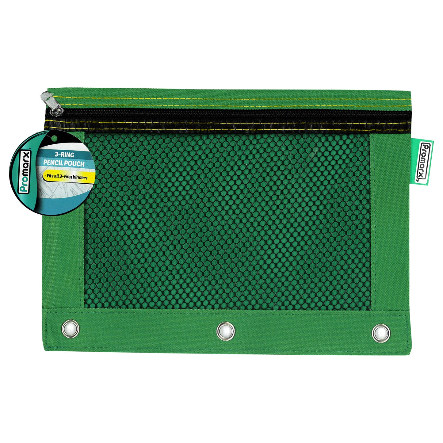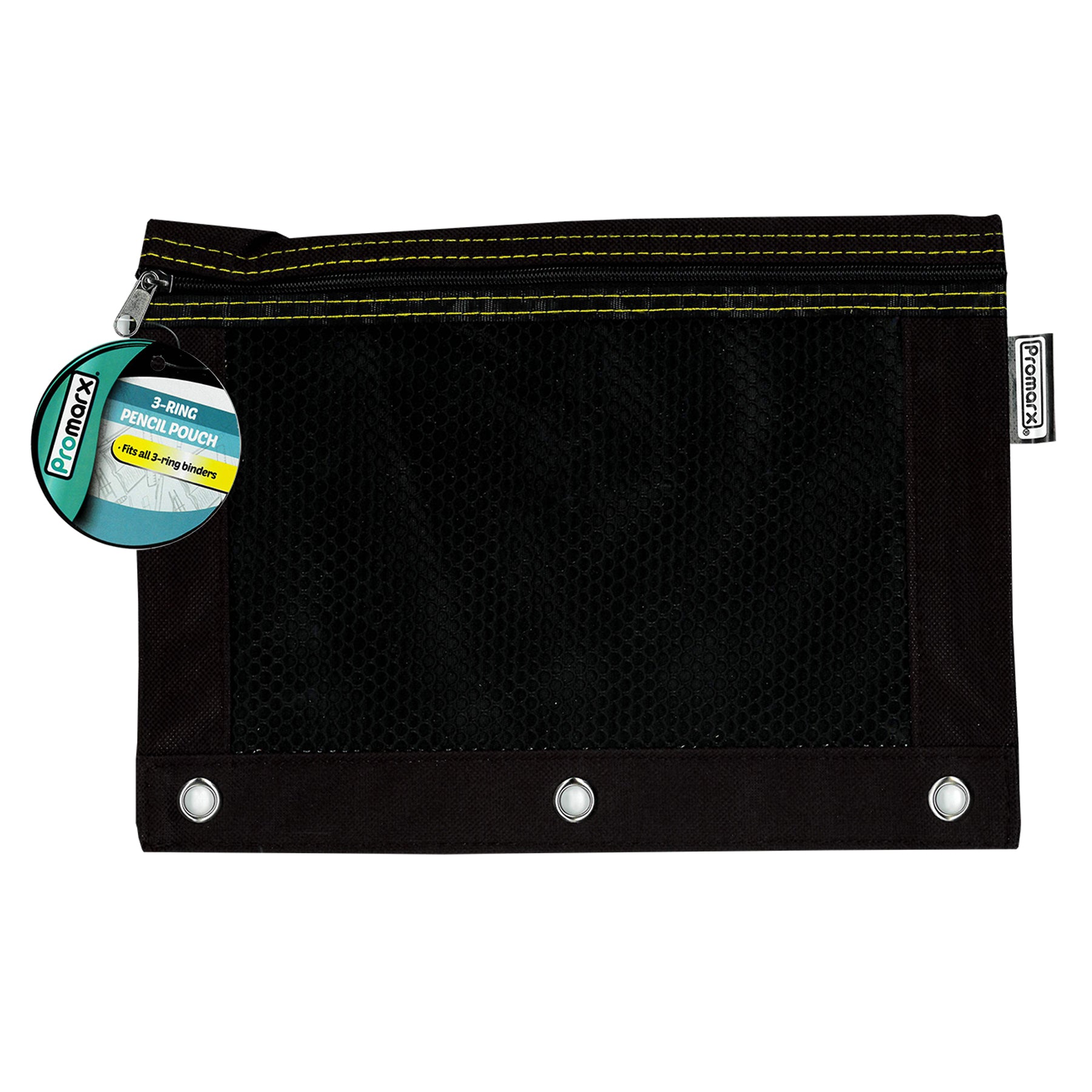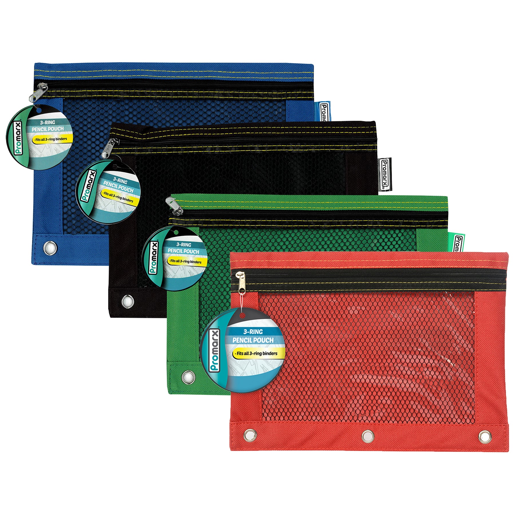 Promarx® 3-Ring Pencil Pouch with mesh window fits all 3 ring binders. Pouch measures 10" x 7.5". Sold in 4 assorted colors: black, red, blue, and green (no color choice upon ordering). Sold as a pack of 12 pencil pouches.