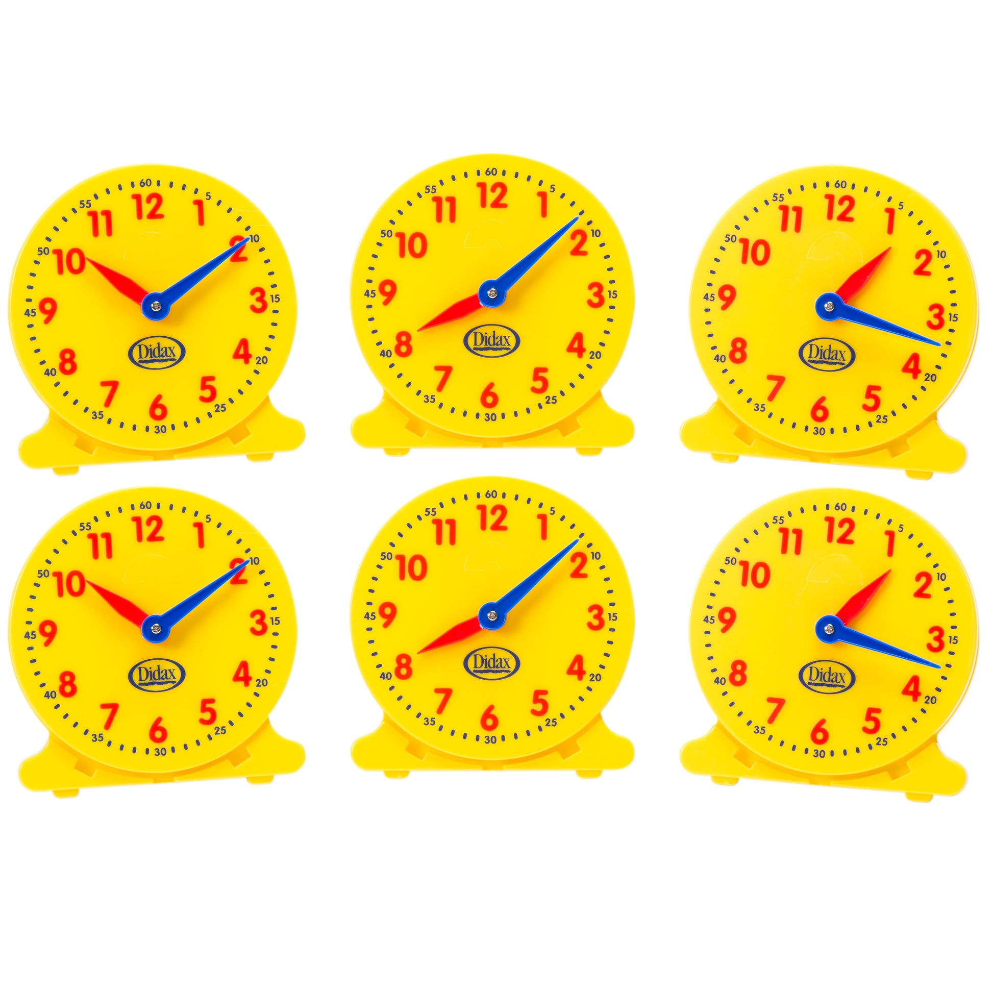 The hands of the 12-Hour Student Clock move together on a gear to maintain accurate hour and minute relationships. Ideal for teaching young students the concept of telling time. Measures 5" diameter. Durable plastic. Each set includes 6 clocks.
