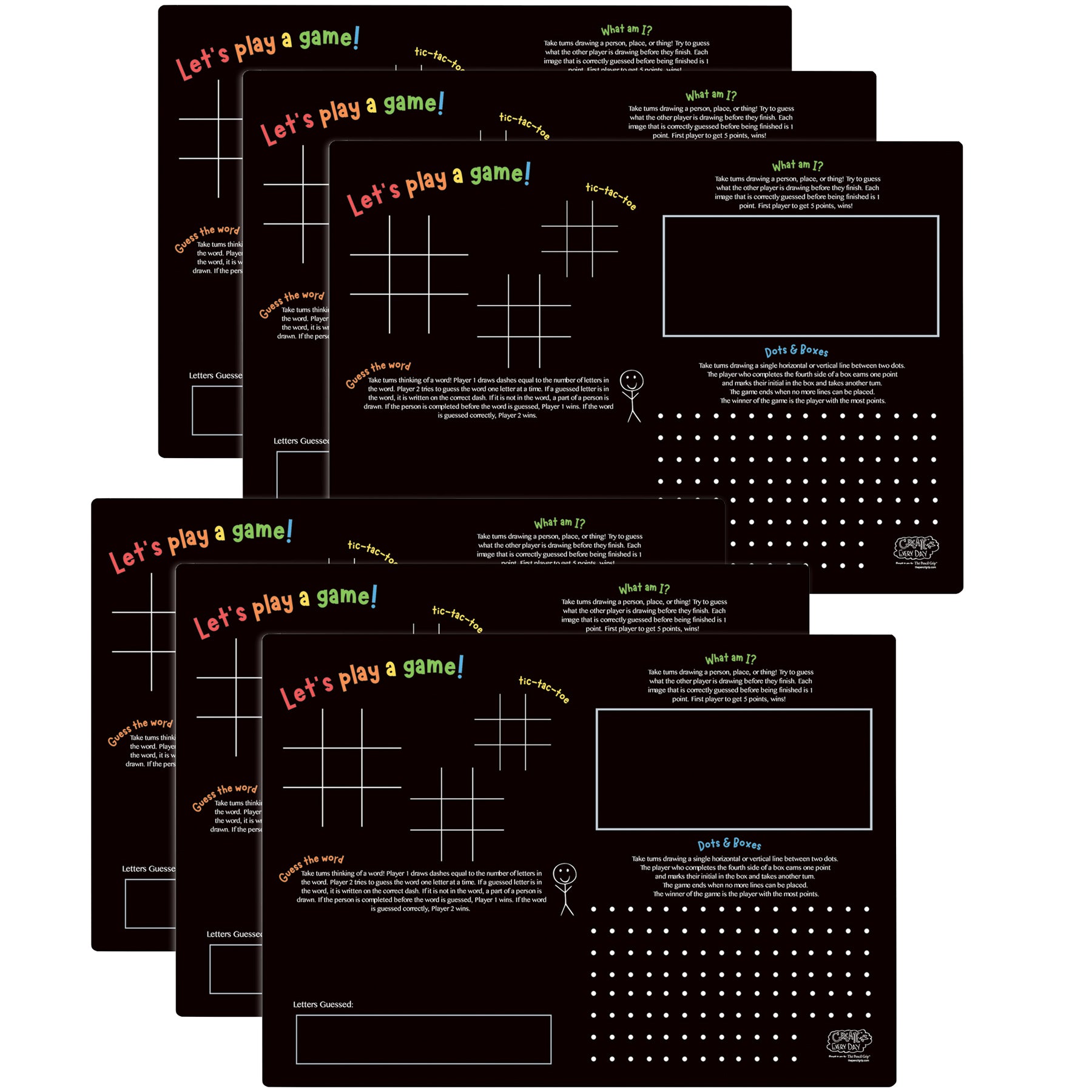 Our new Games activity playmat is the perfect way to stay entertained for travel, play dates, dinner time, restaurants and more! Choose from 4 different games including Tic-Tac-Toe, What Am I?, Guess the Word and Dots & Boxes. Great for on the go and will keep you occupied for hours as you can continue play for as long as you wish! Draw directly on the playmats, and remove with a damp cloth and start over and over again. Playmat is 12" x 17". Reusable playmats are compatible with Wonder Stix. Mess free & easy to clean. Sold as a pack of 6 playmats.