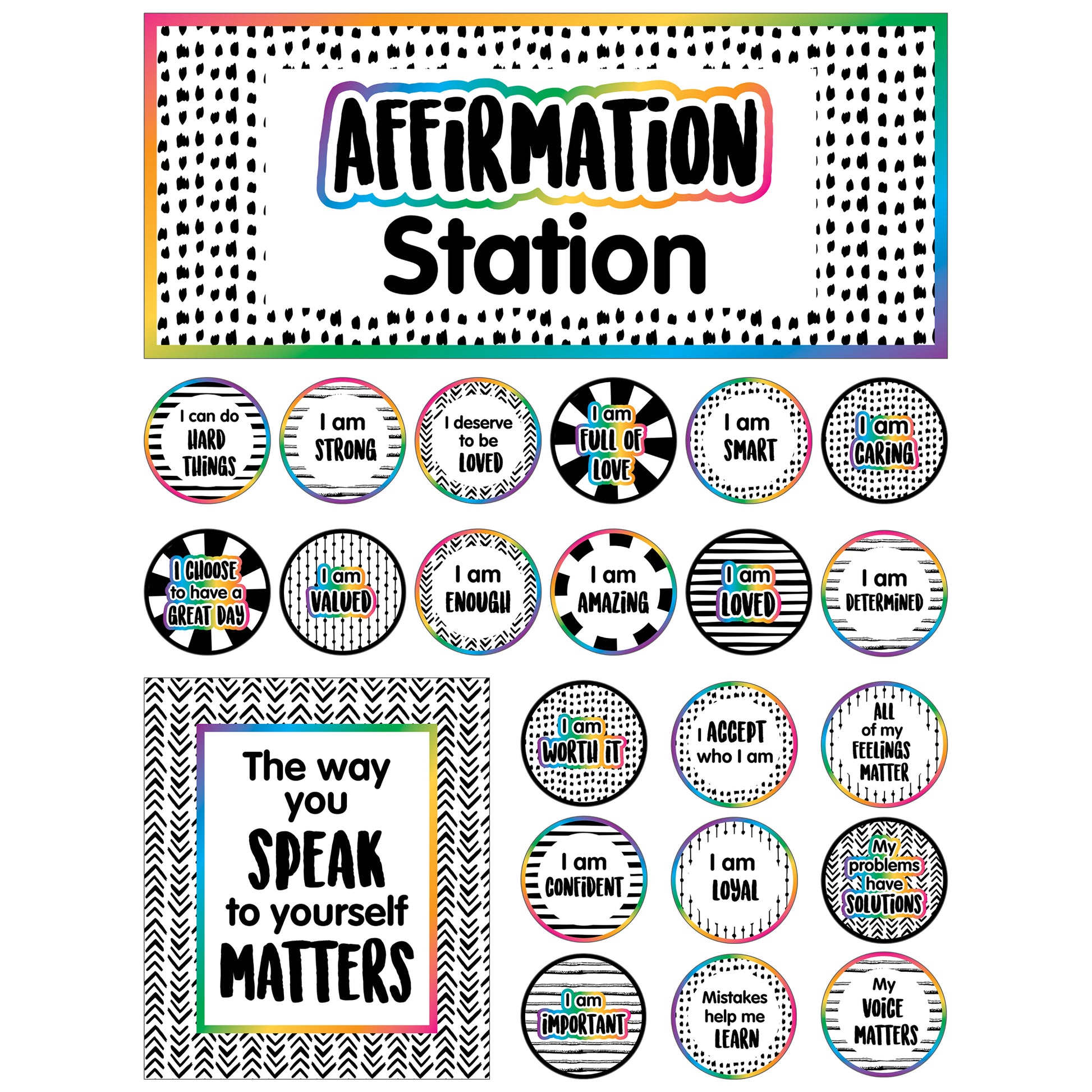 Create a positive learning environment that inspires students to keep trying and believing in themselves with Carson Dellosa's Affirmation Station Bulletin Board Set! The 32-piece classroom décor bulletin board set includes a 32" x 13.7" "Affirmation Station" header, 30 positive affirmations (5" x 5"), and "The way you SPEAK to yourself MATTERS" motivational poster (13.8" x 16")—all made from durable materials to dress up cork board, white board, growth mindset décor, bulletin board décor, and other visual displays with ease. The bulletin board set includes inspirational quotes such as "I deserve to be LOVED", "Mistakes help me LEARN", "The world NEEDS ME", and more. Positive affirmations help students build social-emotional learning skills and self-esteem by replacing negative thoughts with positive ones for a healthy growth mindset that will help them succeed both in and out of the classroom.