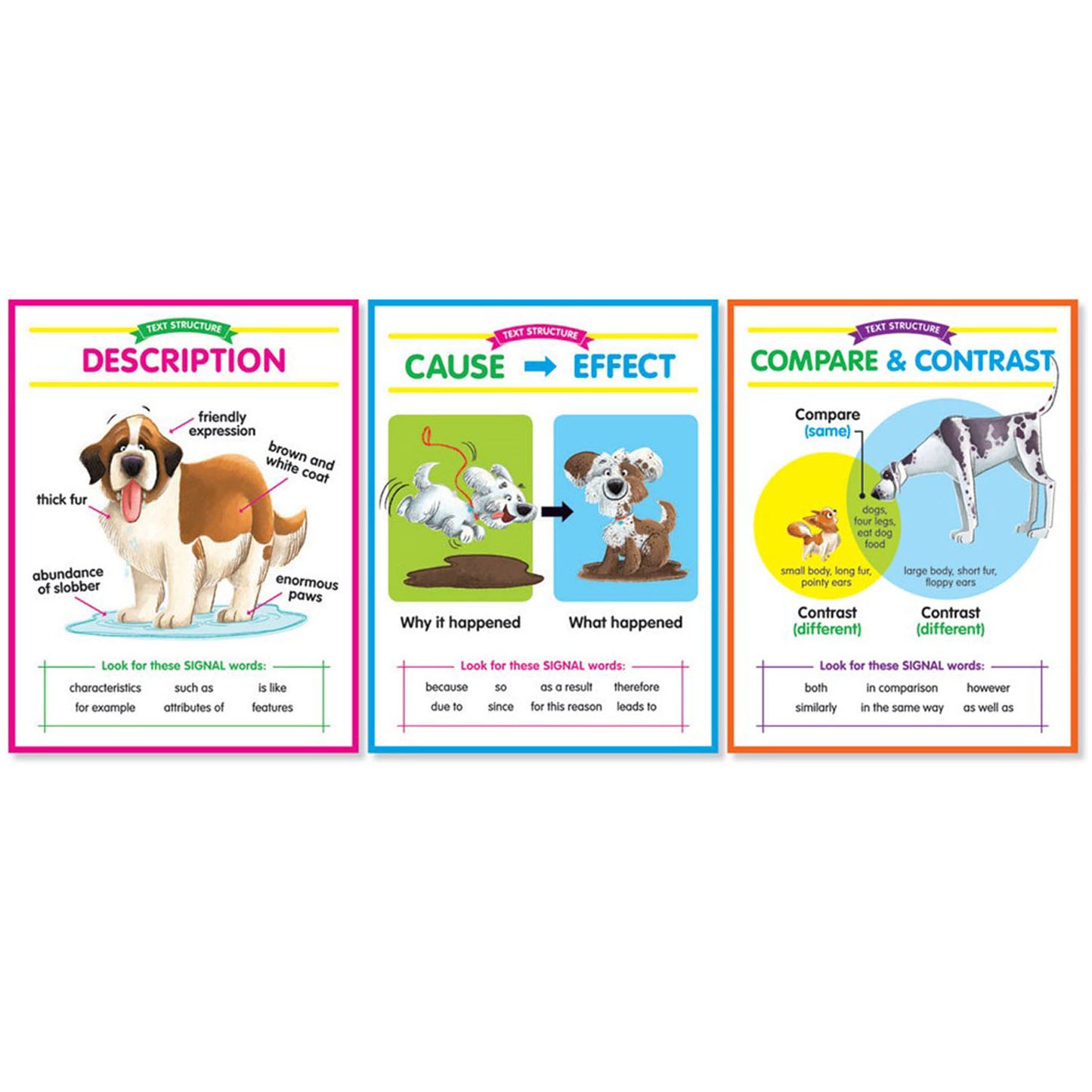 Help students learn text structures with these charmingly illustrated anchor charts. Set includes the five major text structures: Description, Cause & Effect, Compare & Contrast, Problem & Solution, and Sequence. Features a reproducible version on the reverse that students can reference throughout the year.