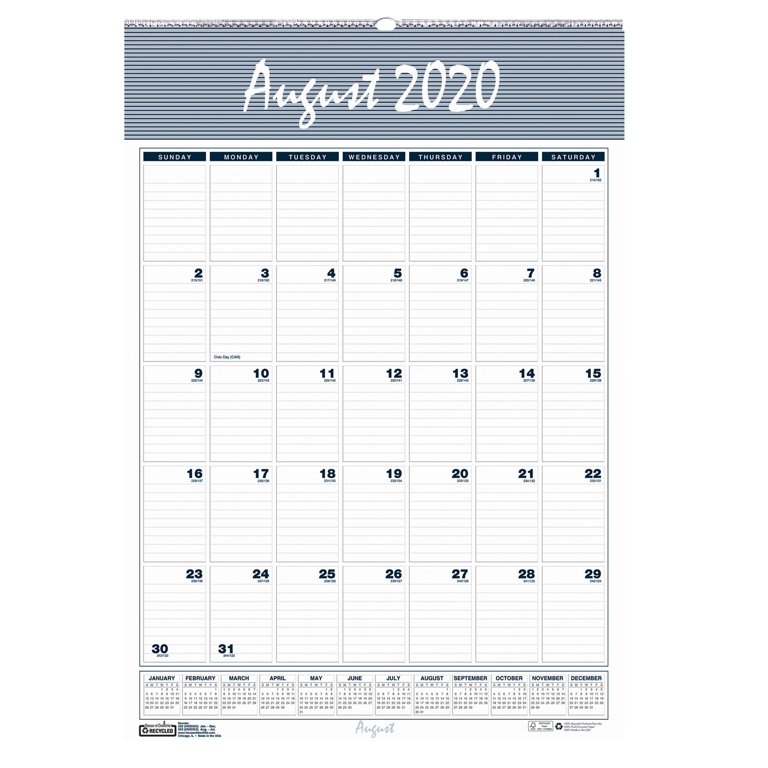 Academic Wall Calendar: August - July. Spiral bound with hanger. Measures 12" x 17". Block size: 1 1/2" x 2 1/4". Full year reference calendar on each month printed In Wedgwood blue and gray. Full chipboard backer. Printed on 100% post-consumer recycled paper. Made in USA