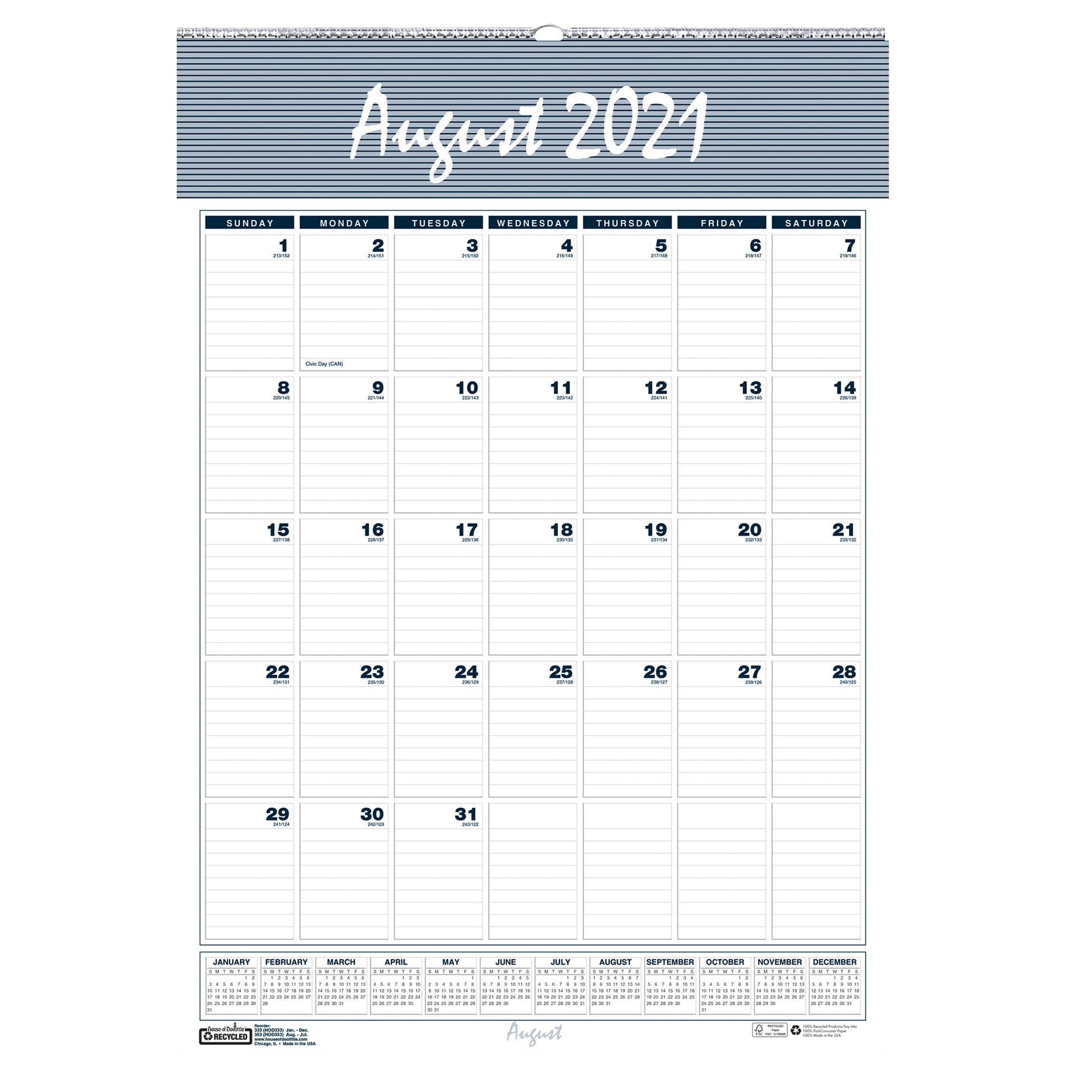12 Months: August-July. Julian dates and days remaining. National, Canadian and religious holidays. Printed in soothing Wedgewood blue and gray. Full year reference calendar on each sheet. Lightly ruled daily blocks. Wire bound with hanger. Block size 2 5/8" x 4 1/4". M measures: 22" x 31 1/4". Printed on 100% post-consumer recycled paper with soy ink. Made in the USA.
