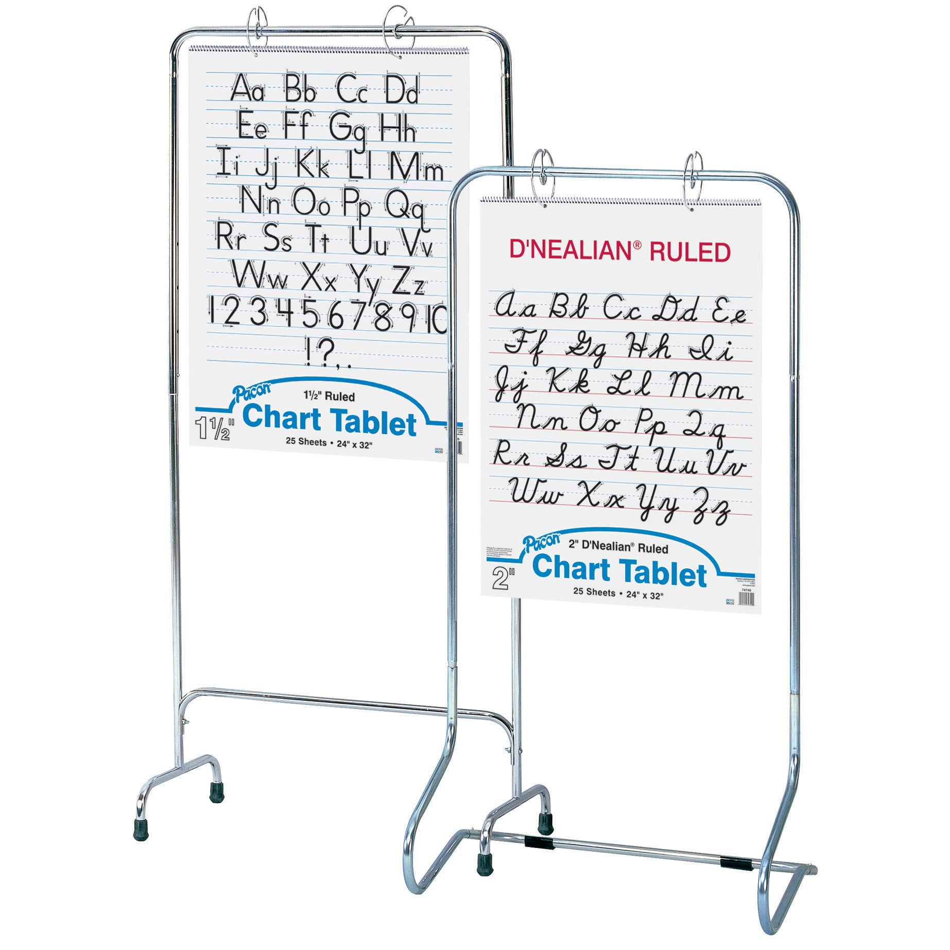Tubular metal stand with rubber-tipped legs holds individual sheets or full chart pads. Two Chart Stand Rings are included with each Chart Stand. This stand measures 28" wide and adjusts in size up to 64" tall.