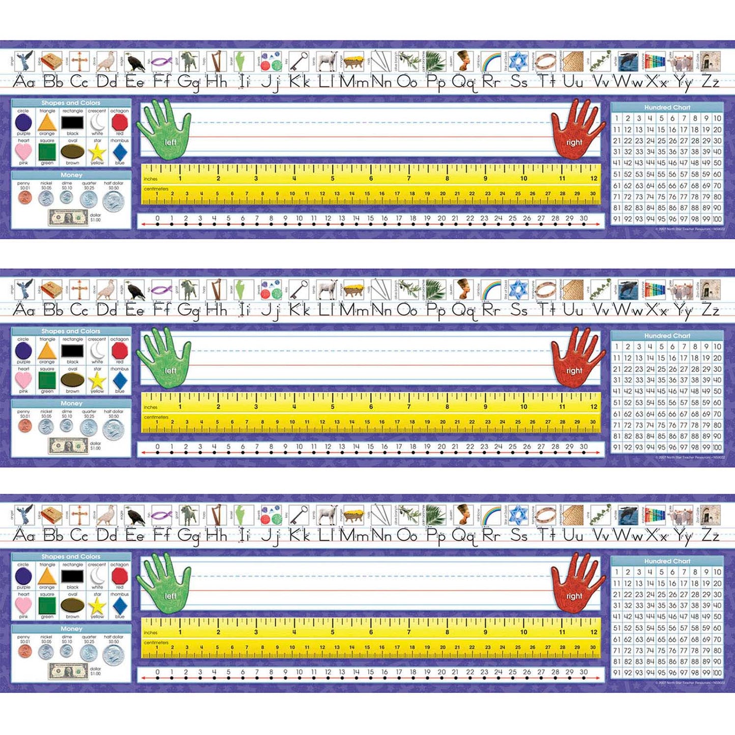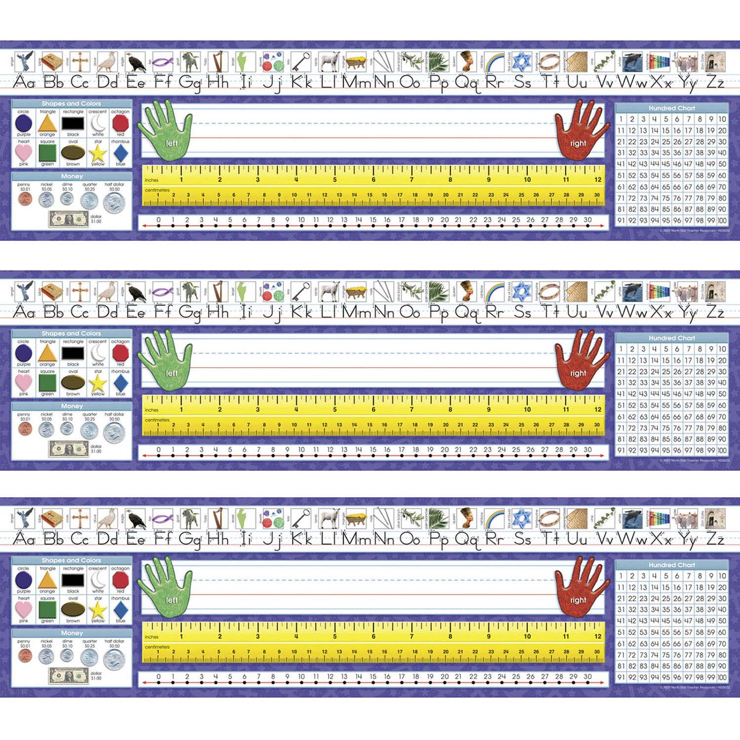Christian Primary Traditional Manuscript Desk Plates include photo alphabet line featuring Biblical images and symbols, name plate with left and right handprints, 12" (30 cm) ruler, number line (0 to 30), shapes and colors, U.S. currency, and hundred chart. Each pack includes 36 desk plates. Sold as 3 packs for a total of 108 desk plates.