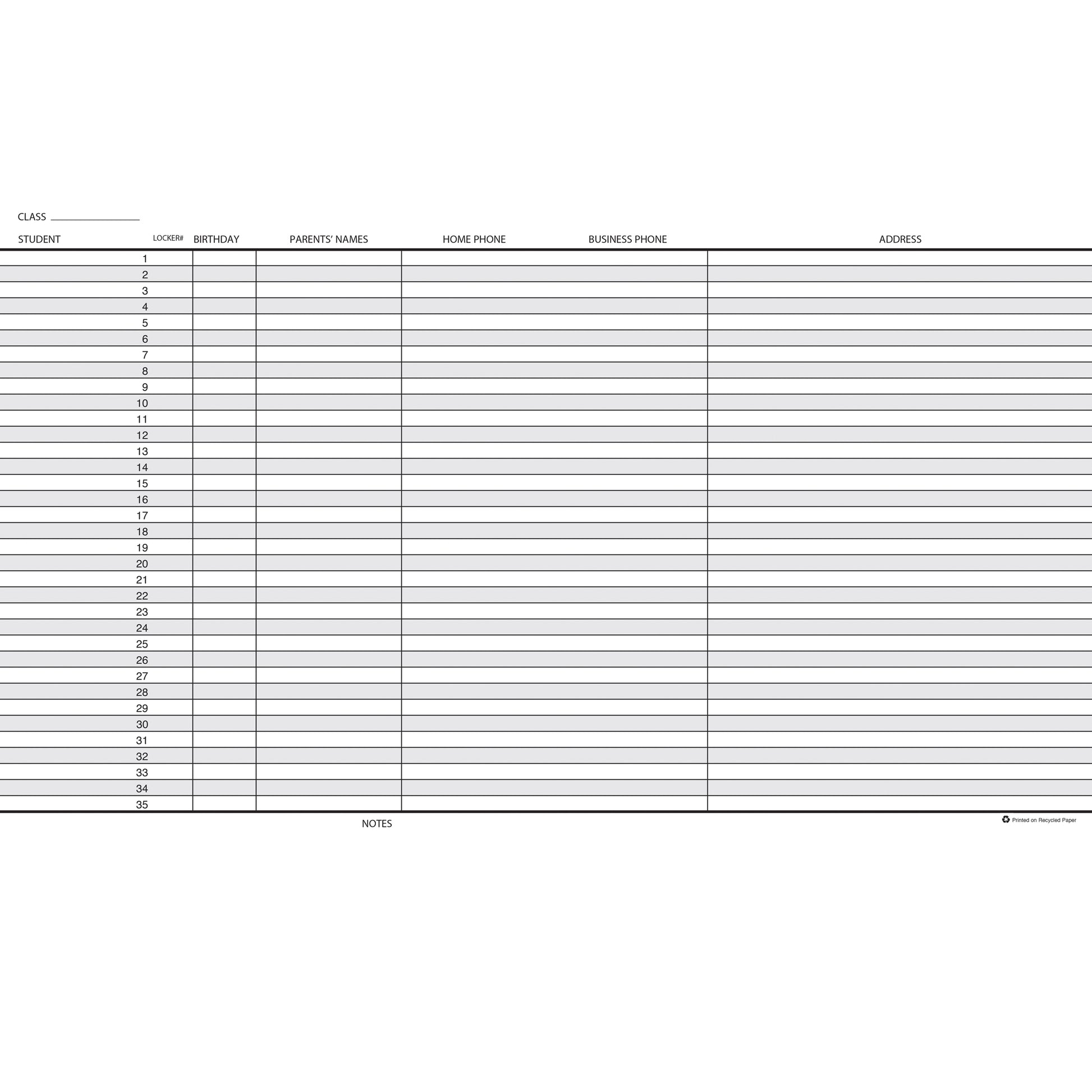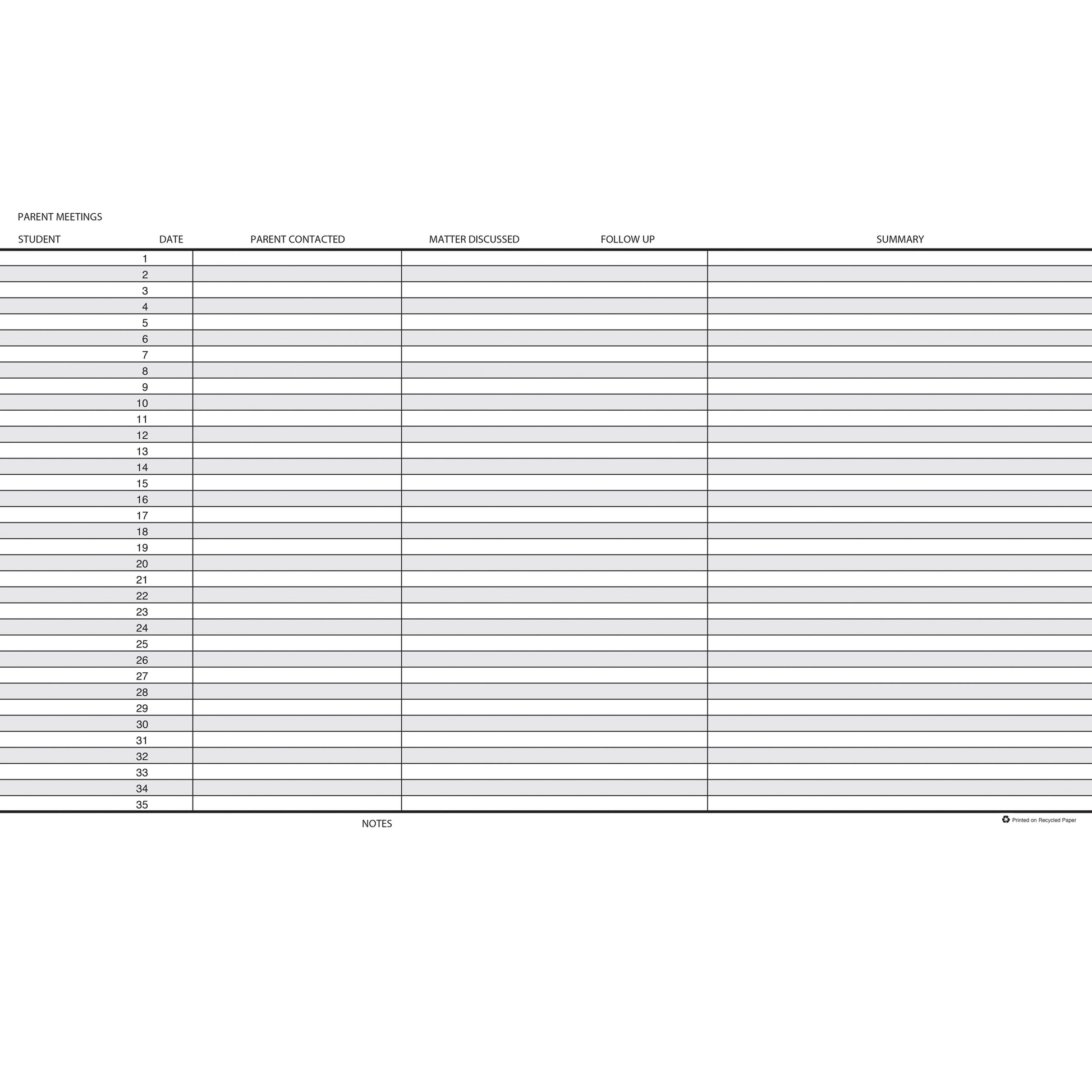 Handy teacher's helper for the professional teacher or home school. Designed for a 9-10 week grading period with 40 weeks of school and 8 classes per year. Features large squares and provides space for 35 students. Includes seating charts, parent meeting log, substitute teacher page, important dates, class names, note pages, and student information pages. Durable blue embossed simulated leather cover will endure frequent daily use and strong wire binding firmly keeps the planner intact throughout the year. Printed on 100% post-consumer recycled FSC certified paper with soy inks. The wire is 90% recycled and our book covers are 50% recycled. Made in the USA. Measures 8-1/2" x 11". Sold as a pack of 2 record books.