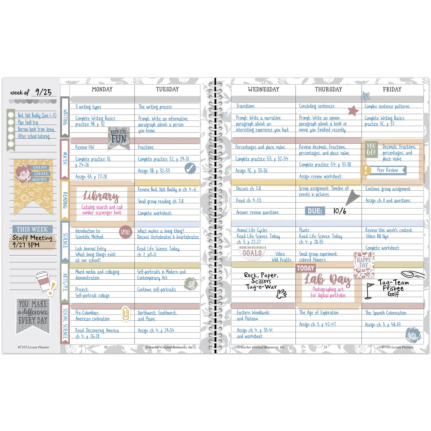 The ideal lesson planner for your highly organized teacher era! Keep up to 40 weeks of daily lesson plans in one convenient book. This book includes substitute teacher information, student roster sheets, and memorable quotations to use and discuss throughout the year. Twelve large monthly planning calendar spreads are also included for year-long lesson planning as well as for scheduling appointments, conferences, and events. The lesson planner also includes a variety of colorful stickers to use throughout the year. Whether you need to prioritize the day’s events, add weekly reminders, highlight something special, or simply provide a bit of inspiration, these cheerful stickers will keep your lessons beautifully organized. Measures 8-1/2" x 11".