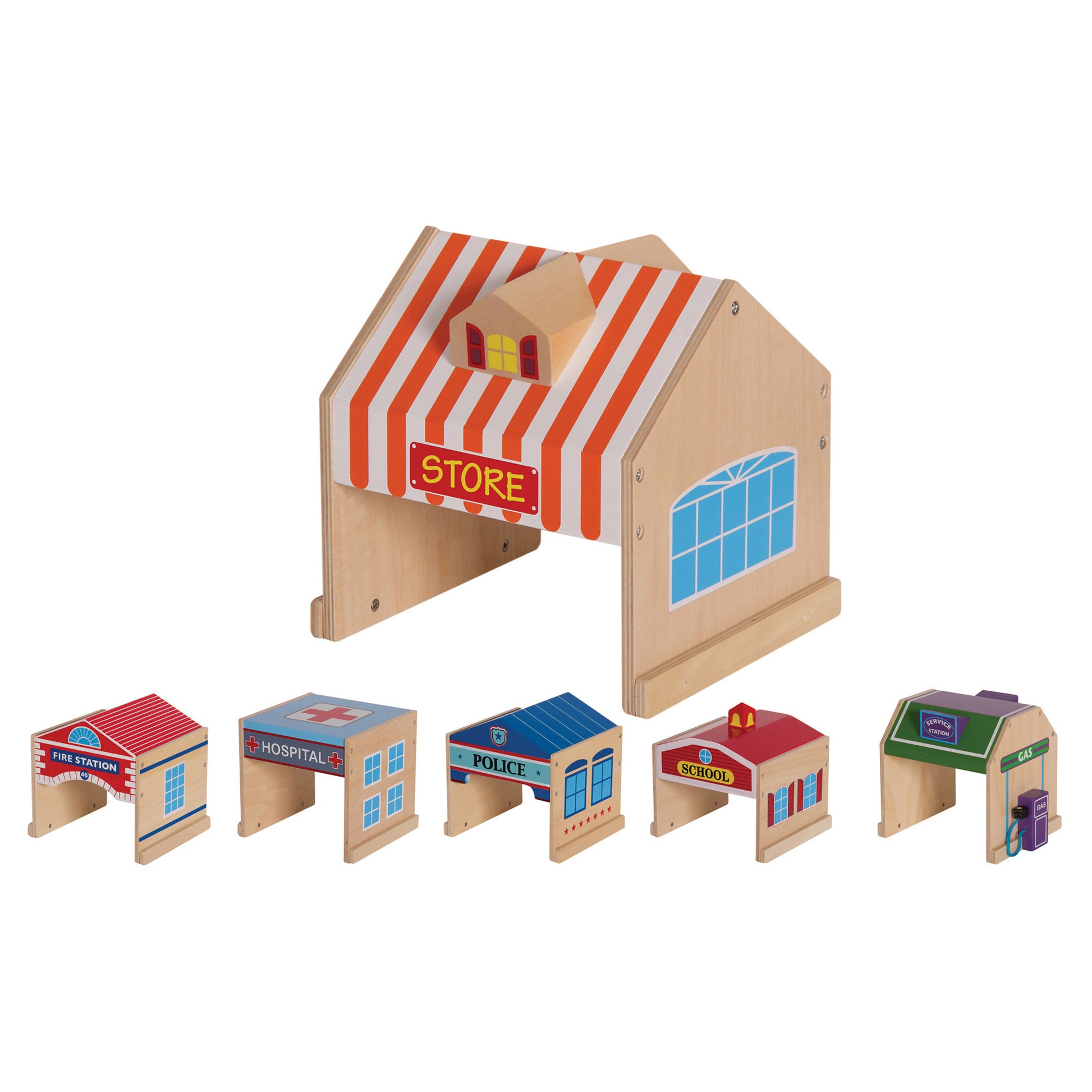 • Set includes: Fire Station, Police Department, Hospital, School, and Grocery Store and Service Station