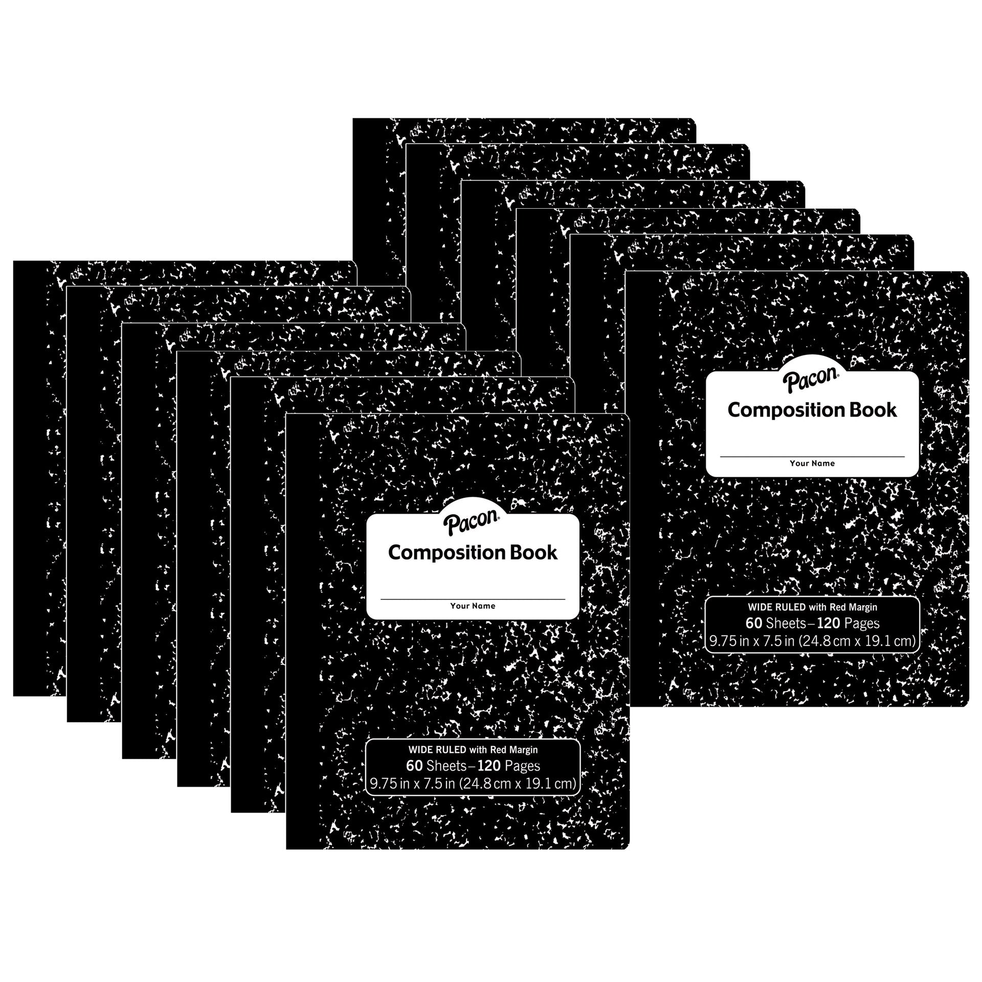 Black marble, hard cover composition book with 60 sheets to meet your needs. Sheets are wide ruled (3/8" ruled) and contain a red margin to help keep your notes neat. Great for note taking and journaling. Recyclable. Measures 9.75" x 7.5". Sold as a pack of 12 books.