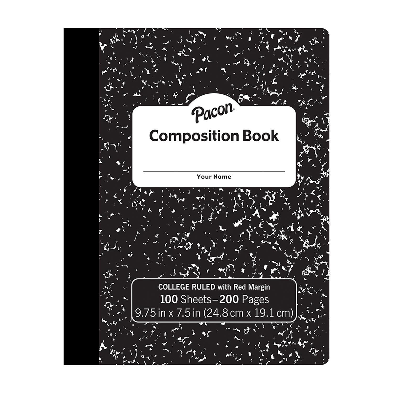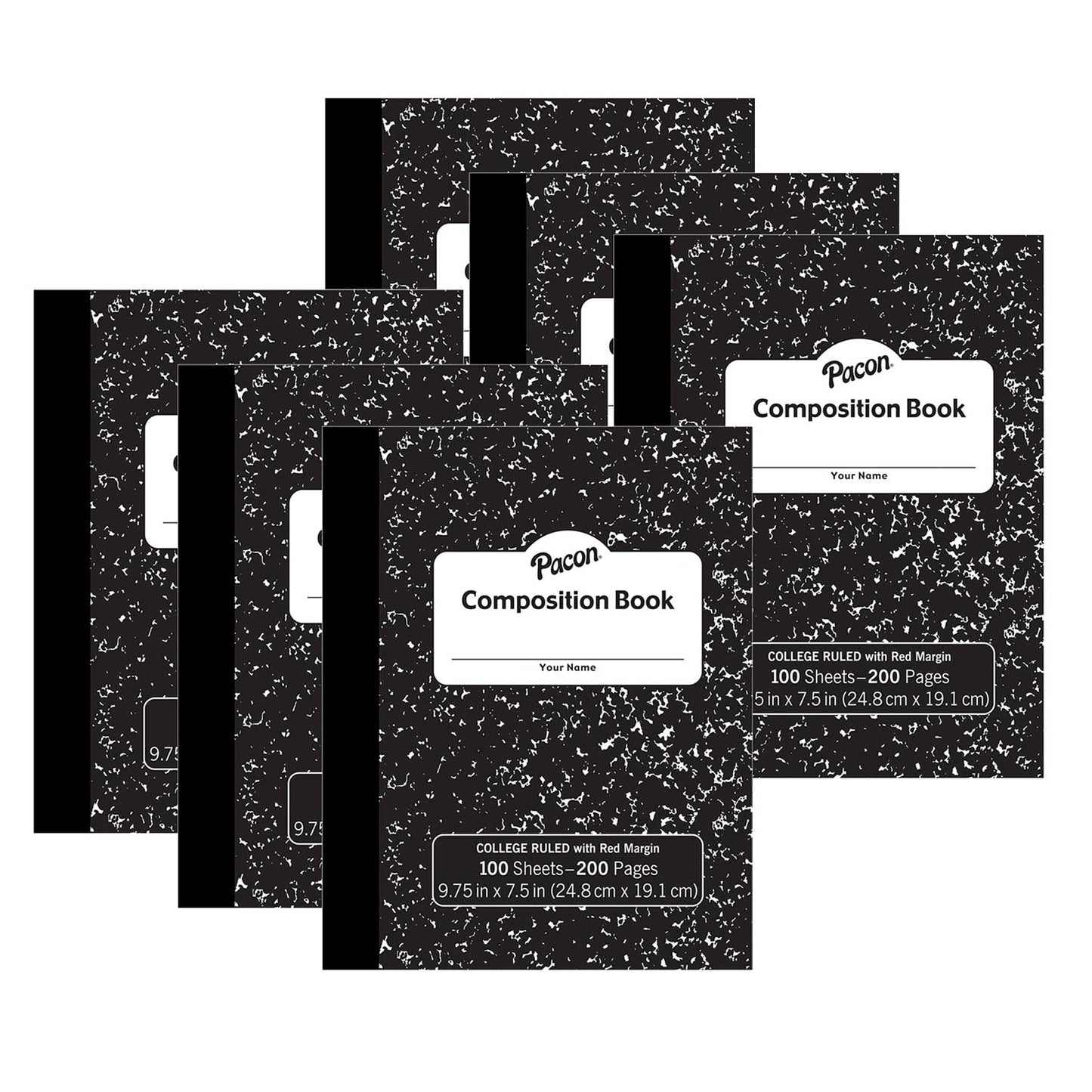 Black marble, hard cover composition book with 100 sheets to meet your needs. Sheets are college ruled (9/32" ruled) and contain a red margin to help keep your notes neat. Great for note taking and journaling. Recyclable. Sold as a pack of 6 books.