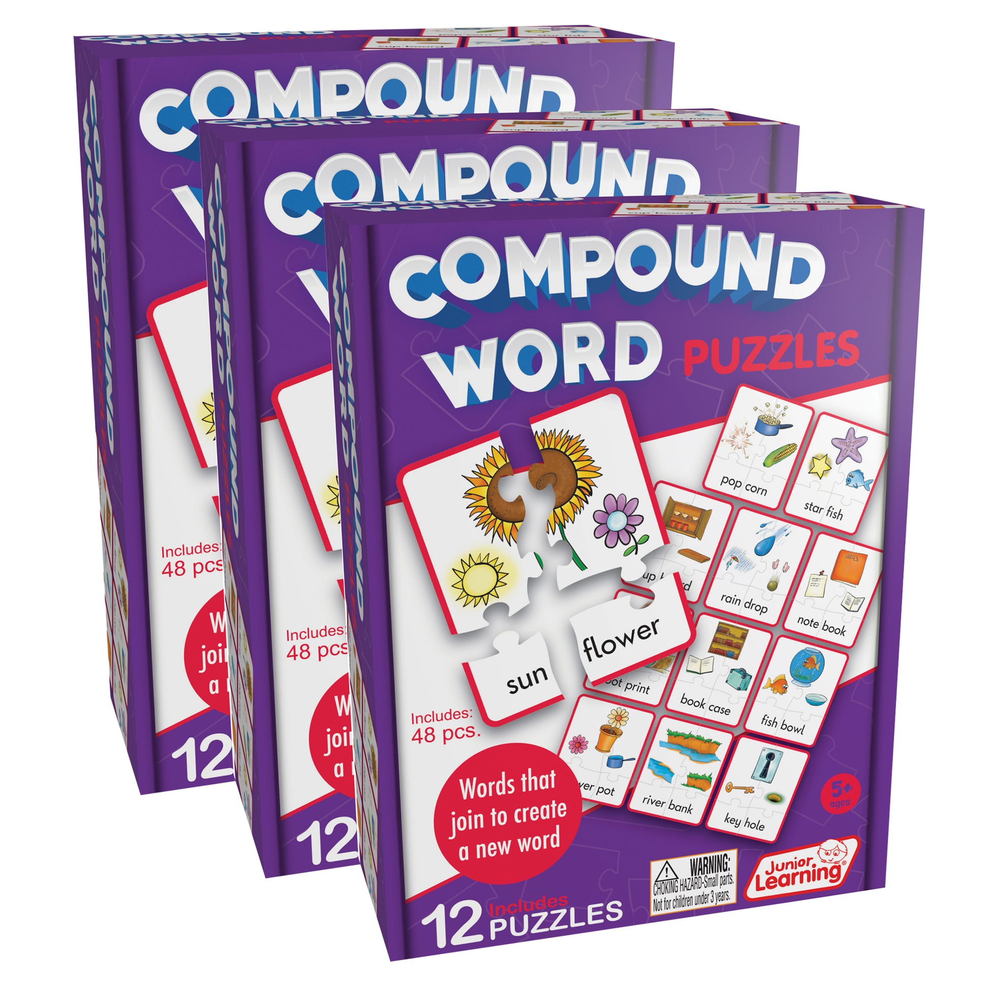 Compound words are 2 separate words that can be joined together to create a new word with a new meaning (such as sun and flower creating sunflower). Piece together the words that can be conjoined with their matching pictures in this self-correcting puzzle, to create a completed card. Ages 5+. Each set includes 12 puzzles (48 pieces). Sold as 3 sets for a total of 36 puzzles.