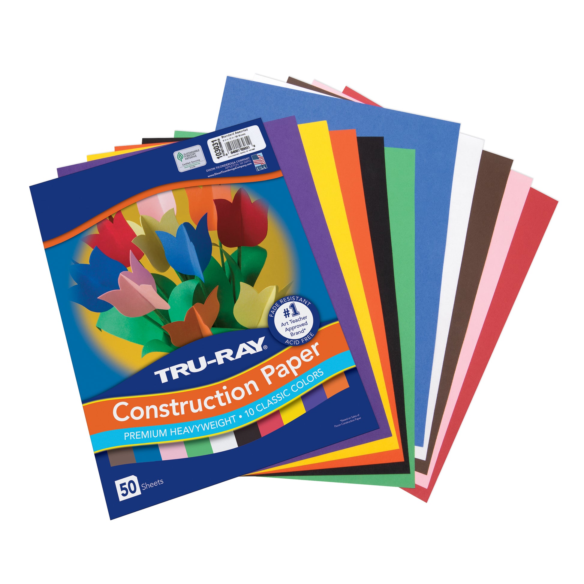 Heavyweight 100% vat-dyed sulphite with longer, stronger fibers. Tru-Ray® Construction Paper is tough enough to take scoring, folding and curling without cracking and tearing. Its superior fade-resistance keeps projects brighter and fresher longer. Standard Assorted package contains 10 colors: Black, Blue, Dark Brown, Festive Green, Orange, Pink, Red, Sky Blue, White and Yellow. Acid-free for less fade. 50% recycled fiber content and recyclable. Each pack includes 50 sheets. Each sheet measures 9" x 12". Sold as 5 packs for a total of 250 sheets.