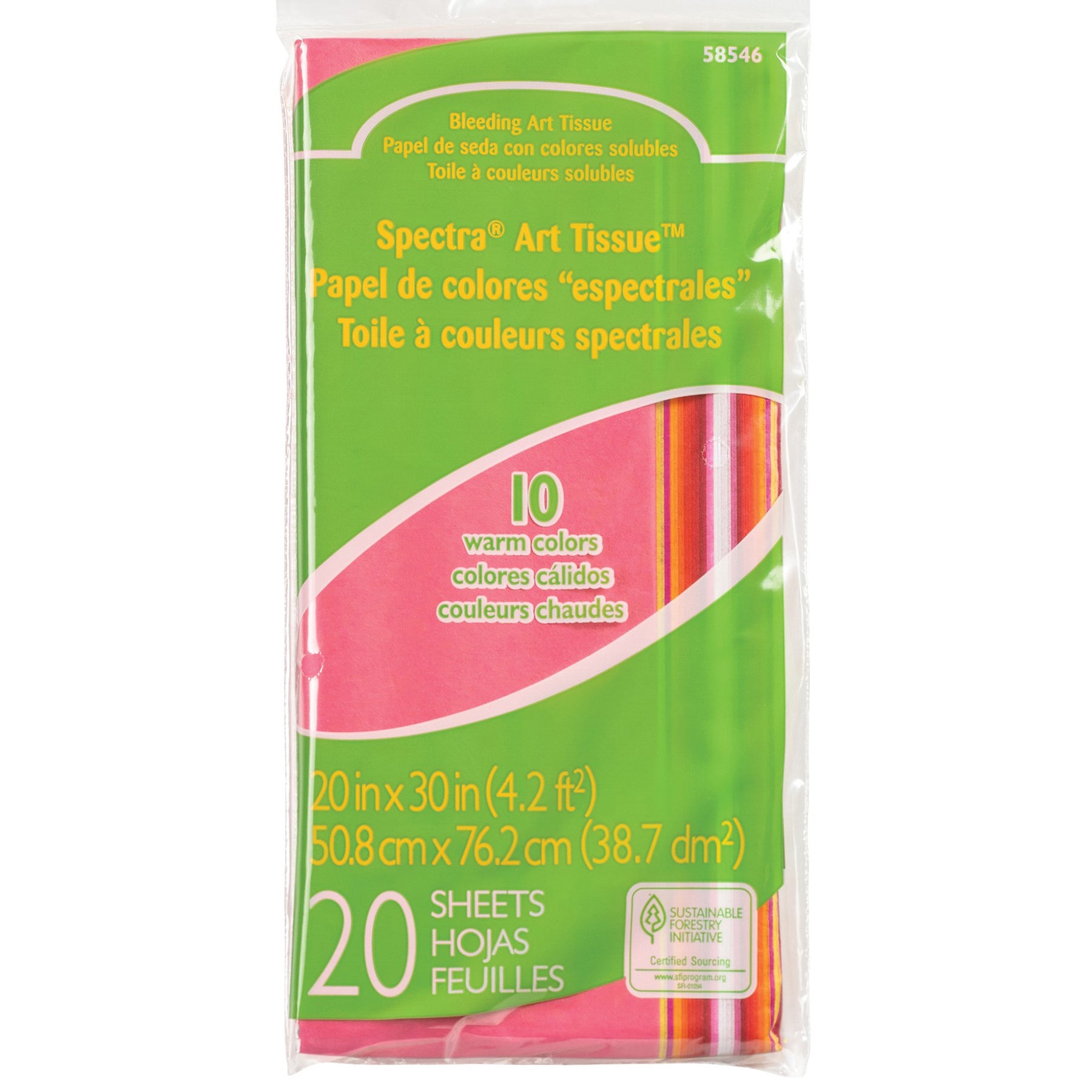 Spectra® Deluxe Bleeding Art Tissue™ is a fine-quality deluxe-grade tissue that bleeds, making it easy to create arts and crafts projects with a beautiful watercolor look. Rich, vibrant colors blend when moistened to create exciting artistic effects. Wet with a brush and wash beautiful, translucent color on to the paper. Overlap two colors and watch them blend. Or, add glue to the water to hold specific shapes in place and create magnificent, multi-layered effects. The high-quality tissue can withstand cutting, crinkling and folding without tearing. This Warm Colors Assortment includes reds and yellows. Two sheets each of 10 colors. Folded package is 6" x 12". Sheets measures 20" x 30". Includes 20 sheets. Sold as 6 packs for a total of 120 sheets.