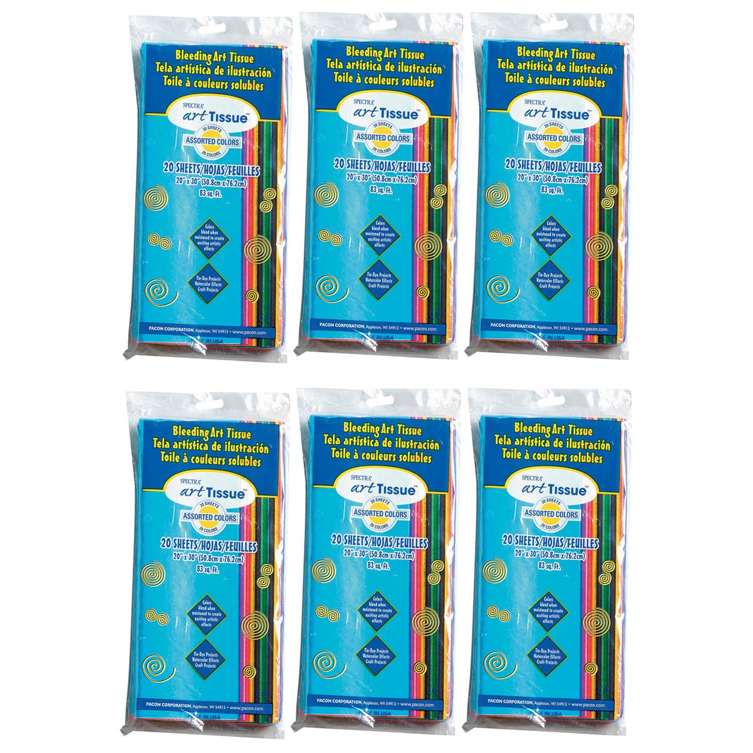 Spectra® Deluxe Bleeding Art Tissue is a fine-quality deluxe-grade tissue that bleeds, making it easy to create arts and crafts projects with a beautiful watercolor look. Rich, vibrant colors blend when moistened to create exciting artistic effects. Wet with a brush and wash beautiful, translucent color on to the paper. Overlap two colors and watch them blend. Or, add glue to the water to hold specific shapes in place and create magnificent, multi-layered effects. The high-quality tissue can withstand cutting, crinkling and folding without tearing. This 20 color assortment includes: Azure, White, Black, Seal Brown, Emerald Green, Apple Green, Spring Green, Canary Yellow, Sky Blue, Orange, Goldenrod, Baby Pink, National Red, Scarlet, Blush Pink, Cerise, Purple, National Blue, Medium Blue and French Blue. Sheets measures 20" x 30". Folded package size is 6" x 12". Each pack includes 20 sheets. Sold as 6 packs for a total of 120 sheets.