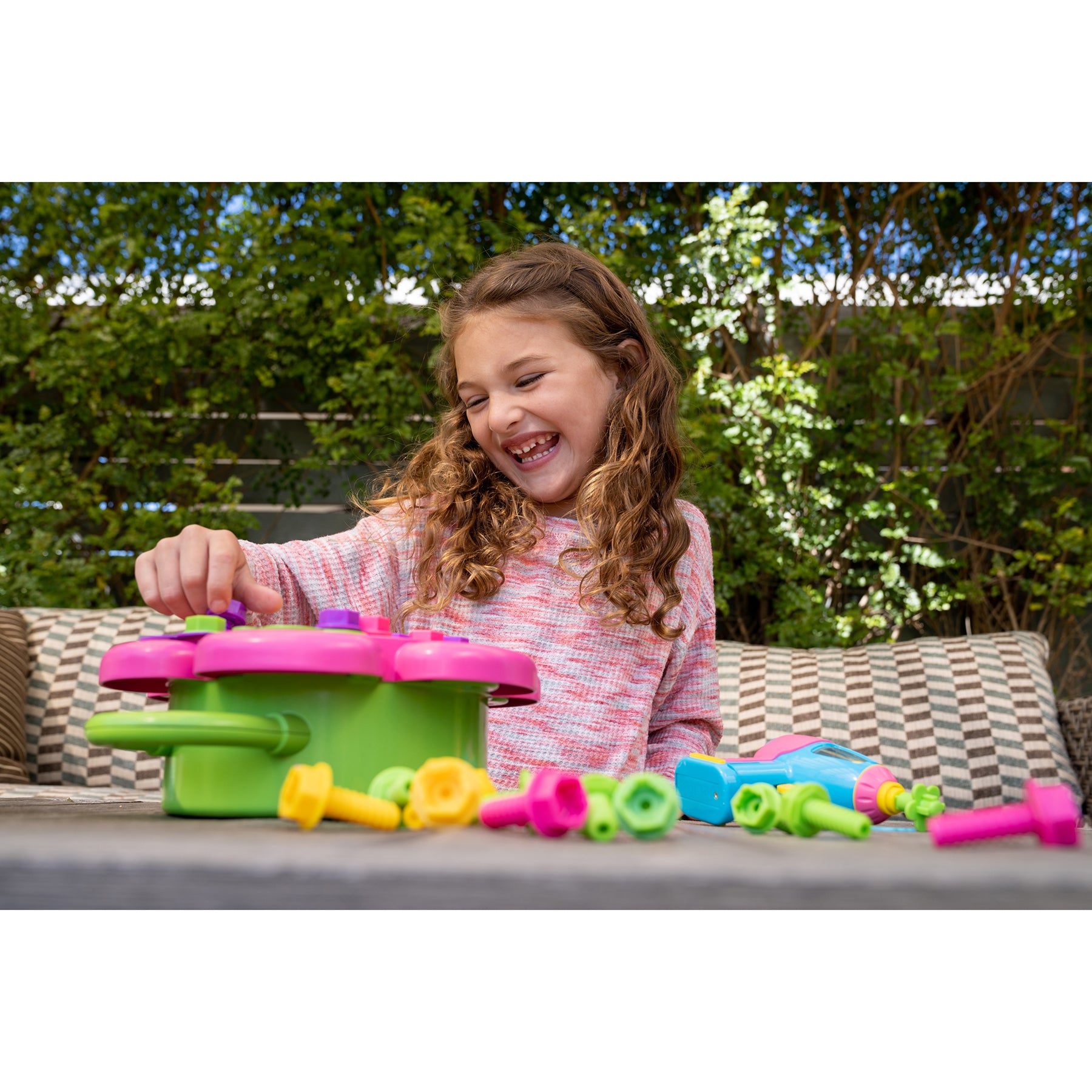 STEM skills are in full bloom with Design & Drill Flower Power! Kids arrange designer plates and colorful bolts into gorgeous, garden-themed designs, then use a real, working power drill with a flower shaped bit and colorful bolts to secure their creations. When it's time to pack up the fun, all pieces fit easily into the flower-shaped design board for easy storage. Best of all, building with Flower Power builds fine motor skills, introduces early math skills including matching, sorting, and patterning, and helps creativity blossom. Includes flower shaped activity board with handle, power drill with flower shaped bit, 40 colorful bolts, 6 designer plates, and activity guide. Requires 2 AA batteries (not included).