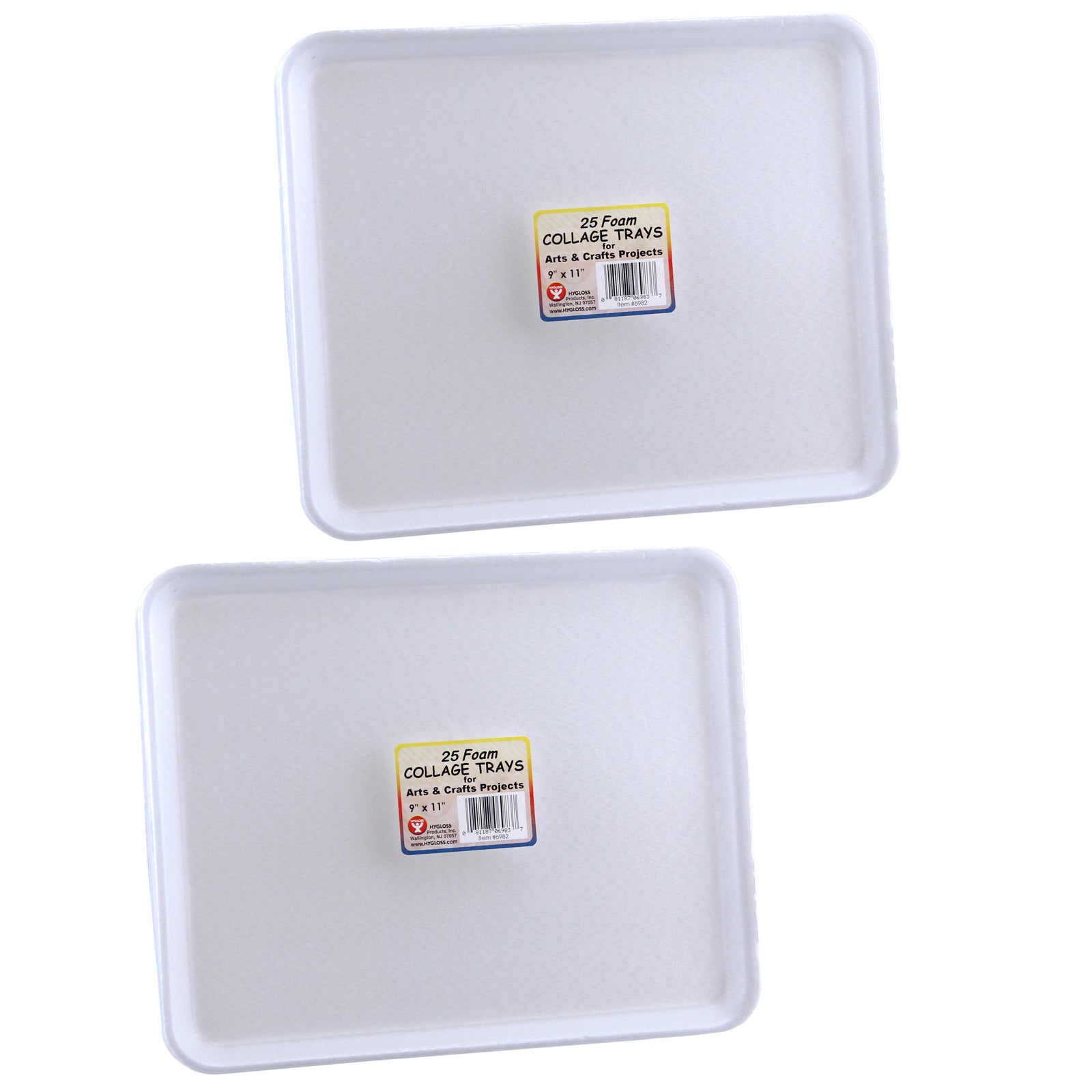 These white foam trays are the perfect backgrounds for your works of art. Bulky craft materials like buttons, gravel, or sea shells often need a sturdy surface, and these collage trays will do the trick! Create stunning artwork using some glue and any craft supplies you have on hand. The foam trays are also useful for handing out project supplies in a class or group setting. Each pack includes 25 trays. Sold as 2 packs for a total of 50 trays.