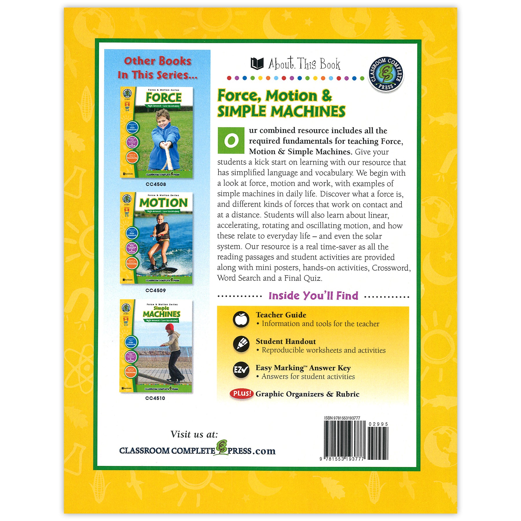 Give your students a kick start on learning with our Force and Motion 3-book BUNDLE. Students begin by exploring different Forces. Conduct several experiments on the force of friction and air resistance. Understand that acceleration and deceleration are examples of unbalanced forces. Next, take the mystery out of Motion. Graph the velocity of students walking home from school at different speeds. Follow directions to find your way using a treasure map. Finally, get familiar with Simple Machines. Conduct an experiment with first-class levers to study distance and force. Find the resistance force when walking up an inclined plane. Each concept is paired with hands-on activities and experiments. Aligned to the Next Generation State Standards and written to Bloom's Taxonomy and STEAM initiatives, additional crossword, word search, comprehension quiz and answer key are also included.