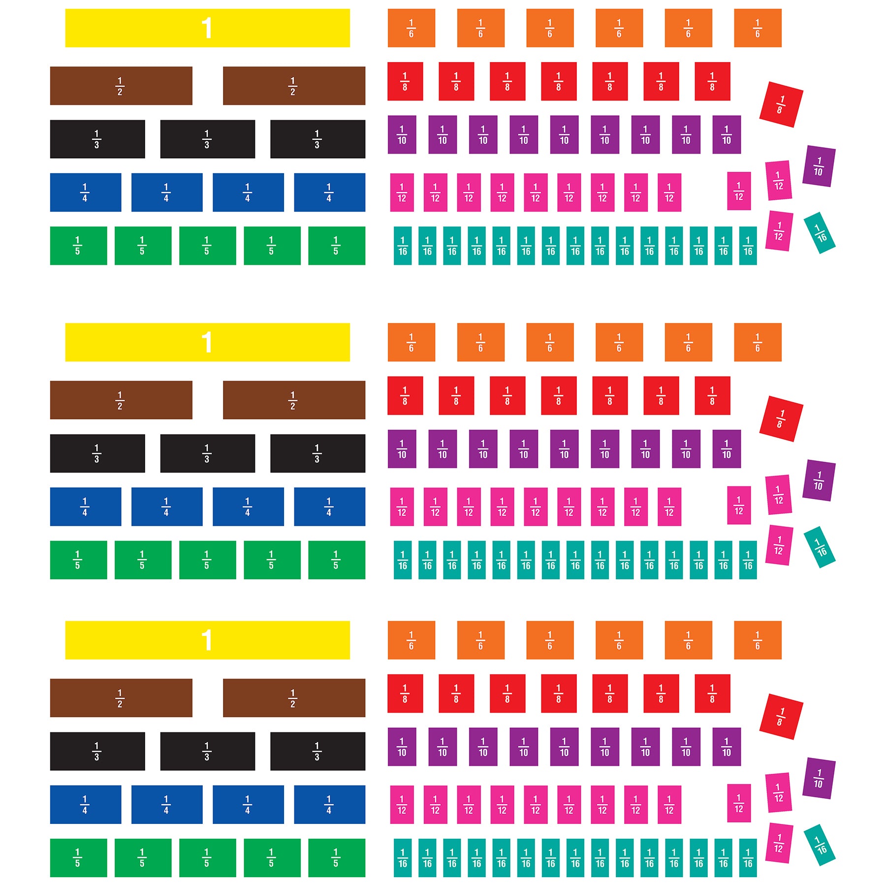 Decorate and educate with these durable, reusable magnetic accents. Add flair to any magnetically receptive surface such as doors, desks, shelving, and bins. Each pack includes 66 total pieces: 1, 1/2, 1/3,1/4, 1/5, 1/6, 1/8, 1/10, 1/12 and 1/16. Largest piece measures approximately 9-1/4" long. Sold as 3 packs for a total of 198 pieces.
