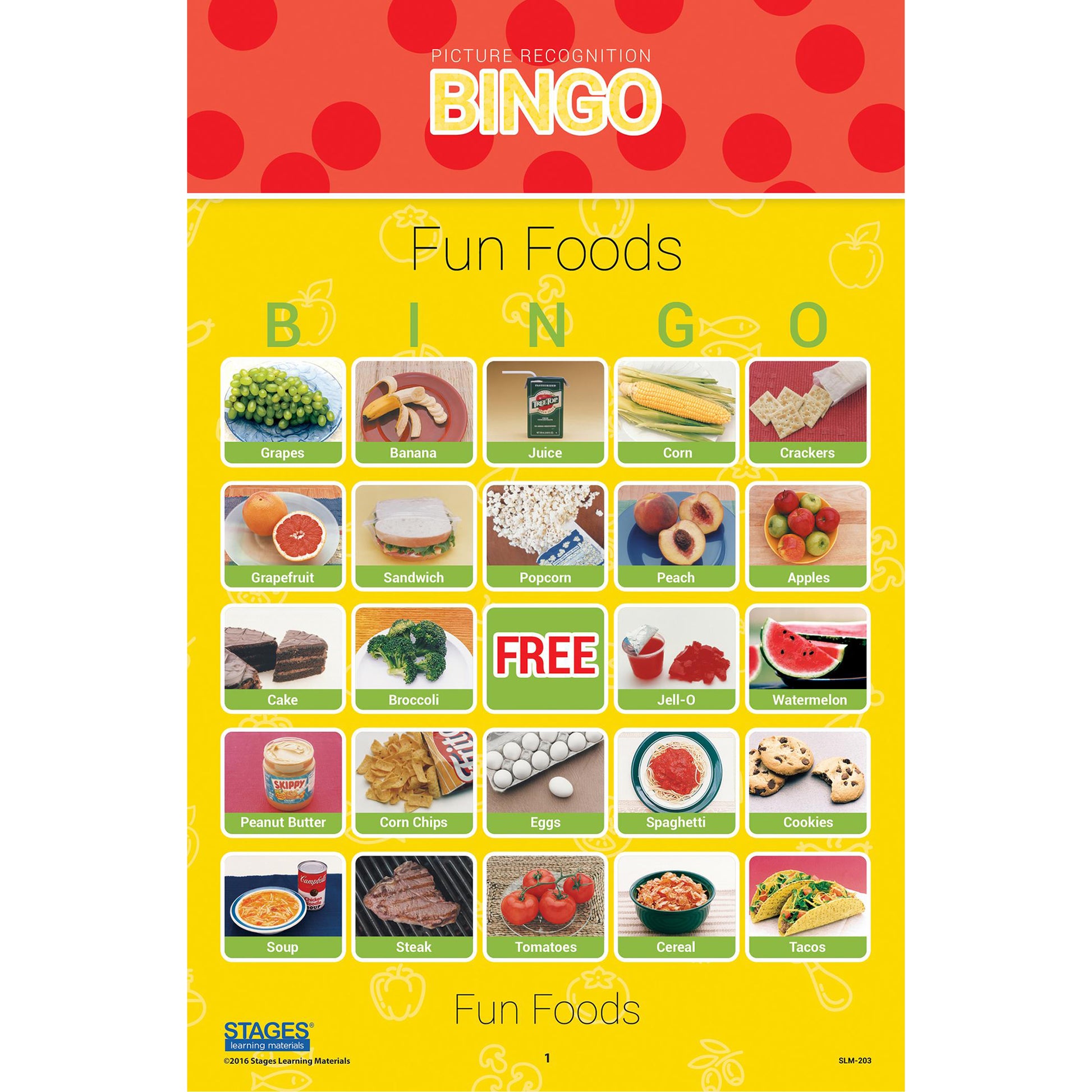 A fun and educational twist on traditional Bingo! Fun Foods Picture Recognition Bingo combines the tried and true fun of bingo with beautiful real photos of 50 common food items. Kids won't even know they're learning while they search their players' cards to match the beautiful food photographs with the words called by their instructor. Just a few of the featured foods include: grapes, banana, corn, sandwich, peanut butter, eggs, tomatoes, carrots, chicken, cookies, peas and more! A large number of the food pictures are of fruits and vegetables, but some "junk foods" have been included to facilitate discussion about which foods are healthy and which are less healthy. Game contents include 36 durable players cards, caller's mat, 50 calling cards, bingo chips, an instruction sheet, and a durable box for years of fun. Ages 3 and up.