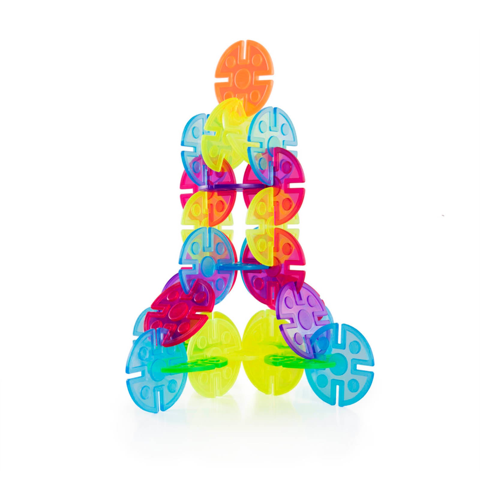 Interlox Discs provide colorful, easily interlocking building pieces to engage children in open-ended play. Discs are made of colorful, translucent plastic with multiple notches for flexible building. Use the five beautiful colors to explore color theory on the LED Light Tablet or for other light and color activities. Children explore the concepts of symmetry and asymmetry while strengthening their design, structure and engineering skills. Use with the original Interlox for even more combinations. Ages 2+.