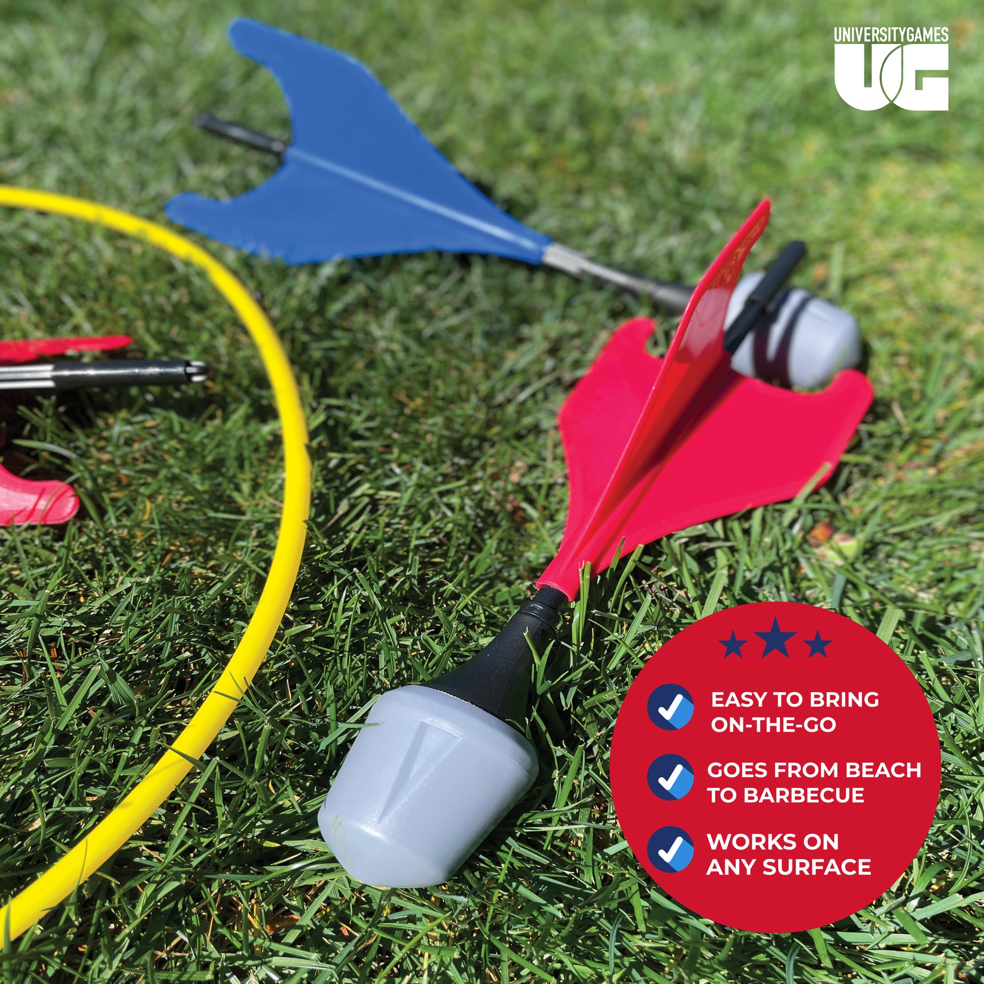 Bring this fun lawn dart game to BBQs, beach parties, camping and picnics. Set includes 4 large lawn darts with rounded weighted tips and easy to grip handles and two yellow target rings. Safe tip design makes this a perfect family game. Works on any surface. For ages 8+.
