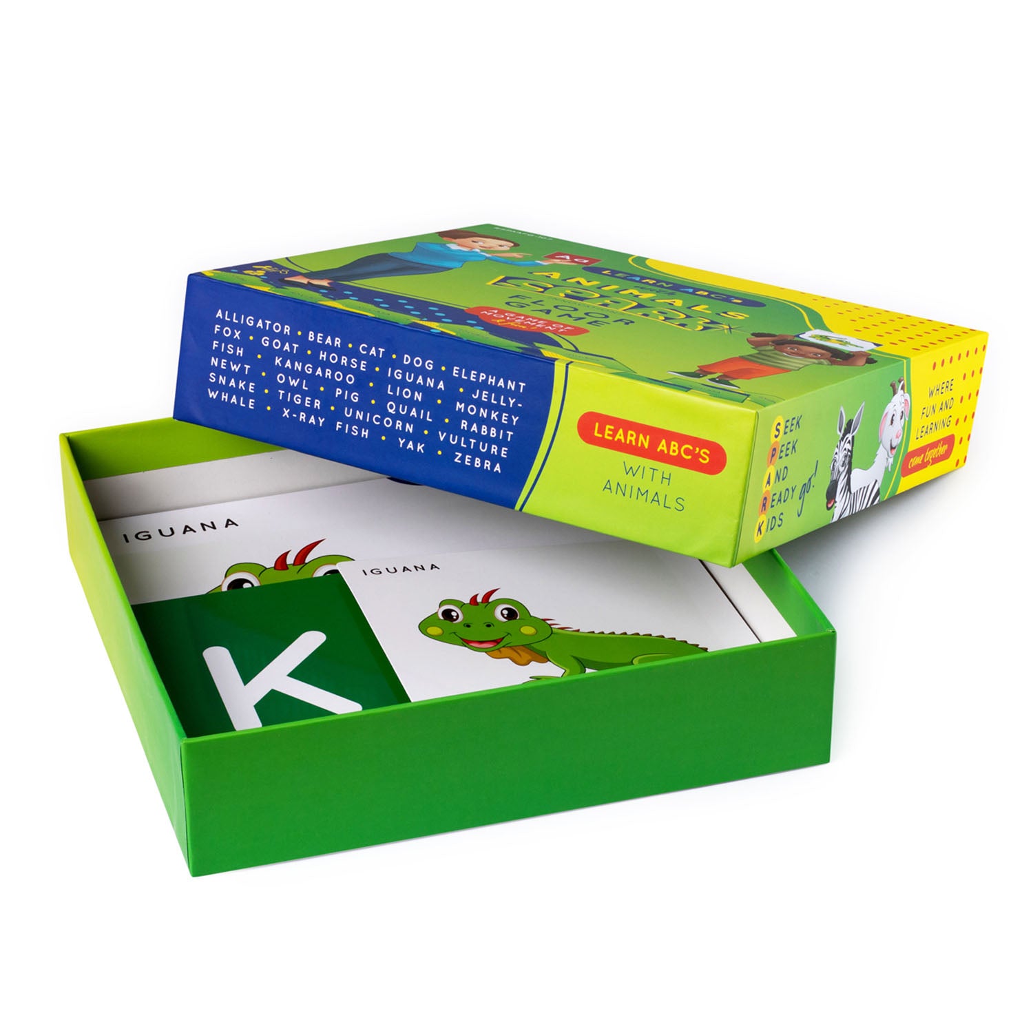 i : Includes 52 laminated thick and colorful animal/ABC cards. There are 26 Jumbo (8x8) floor cards-animals and 26 smaller “show me” cards-double sided animals and alphabet. Interactive user guide with instructions and multiple ways and levels game can be used