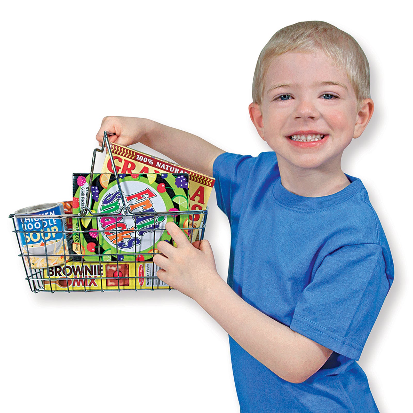 If make-believe fun is on your shopping list, check out this all-in-one kitchen and grocery play set! This realistic wire grocery basket toy is just the right size for pretend play. It comes stocked with play food boxes and play food cans with pop-off lid - in all, eight sturdy, colorfully labeled packages to stock, load and "cook." The wire basket is carefully designed to be comfortable to carry, easy to store and wonderfully durable. The sturdy handles fold flat for easy folding or stacking, then lift up to carry around the "shop."