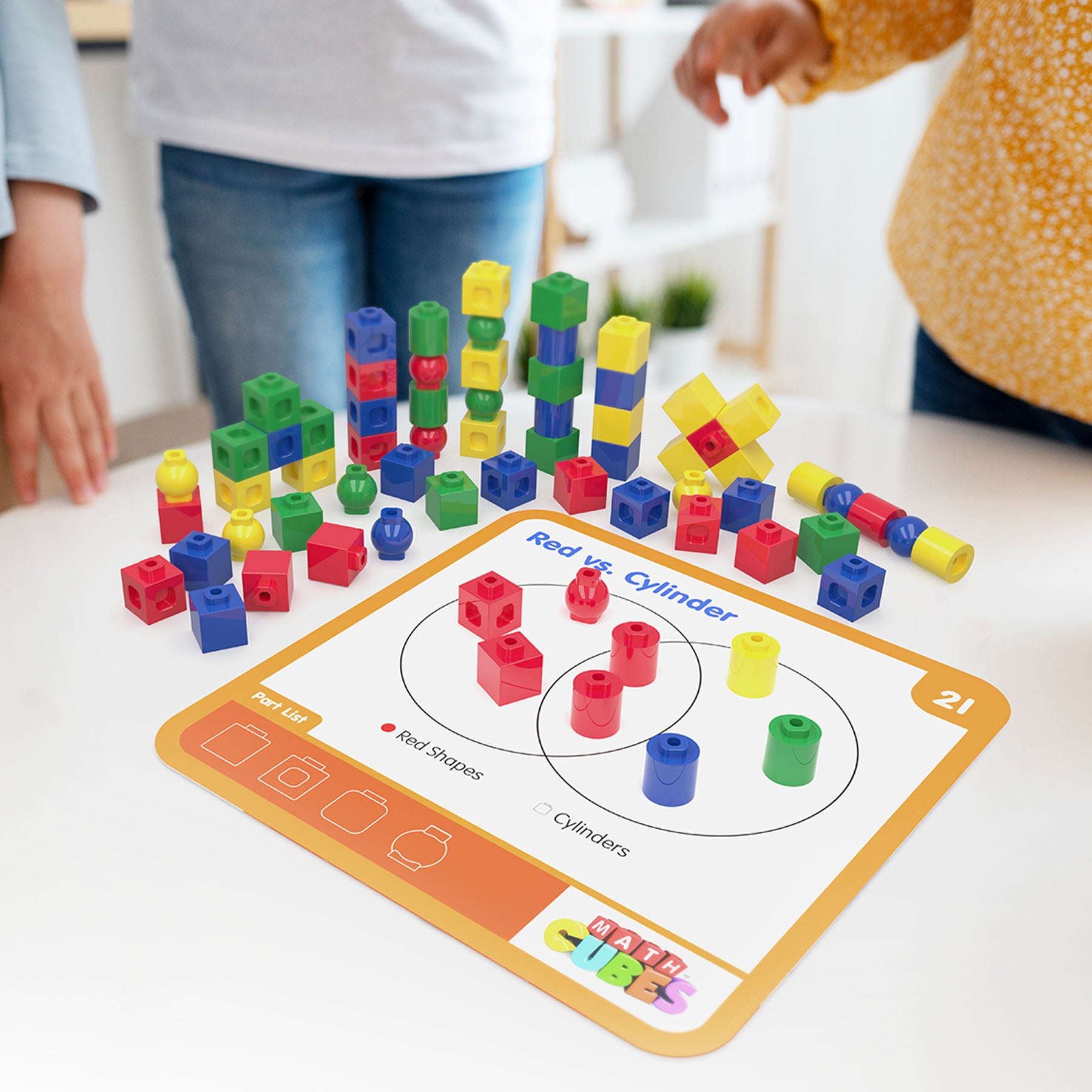 v : 72 vibrant, tactile pieces for interactive learning: Mathcubes, Multicubes, cylinders, and beads included.