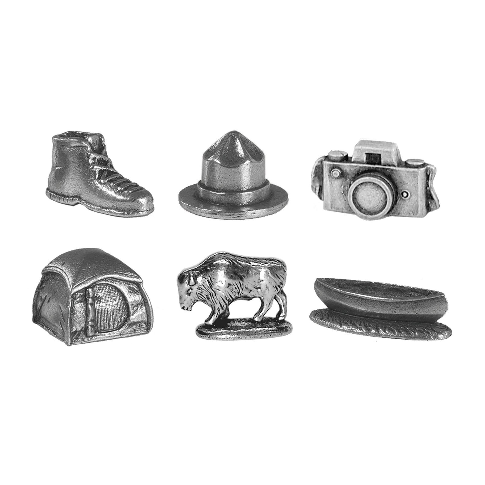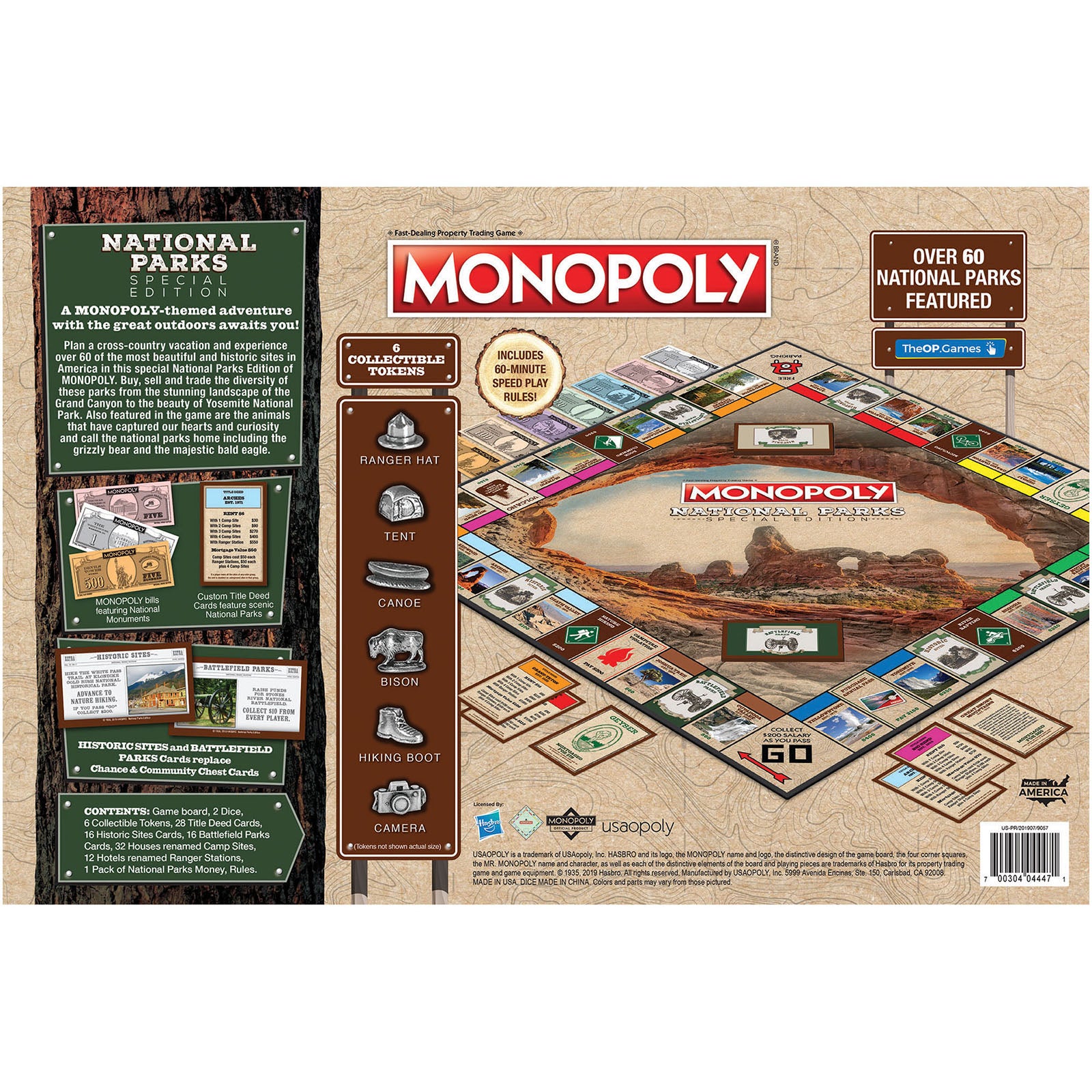 Celebrate the beauty of America's National Park system with MONOPOLY: National Parks. The game features over 60 of the most beautiful and historic sites in America from the stunning landscape of the Grand Canyon to the awe inspiring wonder of Yellowstone. Also featured in the game are the animals that have captured our hearts and curiosity and call the national parks home. Journey into the heart of America without ever leaving home with MONOPOLY: National Parks Edition. For 2-6 players ages 8 and up. Game includes: • Custom National Parks themed game board featuring 60 National Parks throughout game including Yellowstone (1872), Yosemite (1890), Sequoia (1890), and more. • Educational game matching animals to the parks they inhabit • Custom Money featuring National Monuments: The White House, Thomas Jefferson Memorial, Lincoln Memorial, Washington Monument, Mount Rushmore, Statue of Liberty, Devil's Tower • 6 Collectible Tokens including Ranger Hat, Tent, Canoe, Bison, Hiking Boot, and Camera