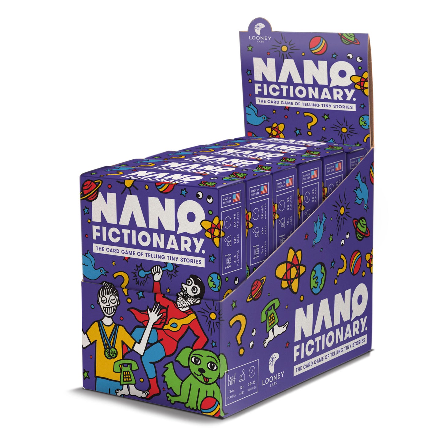 Nanofictionary is a story-telling game in three rounds. In the first phase, everyone builds a collection of story elements, featuring at least one of each type. Next, players take turns telling a brief story based on the ideas in the set of cards they selected. Lastly, everyone votes for the story they liked best (besides their own). Whoever gets the most votes wins!