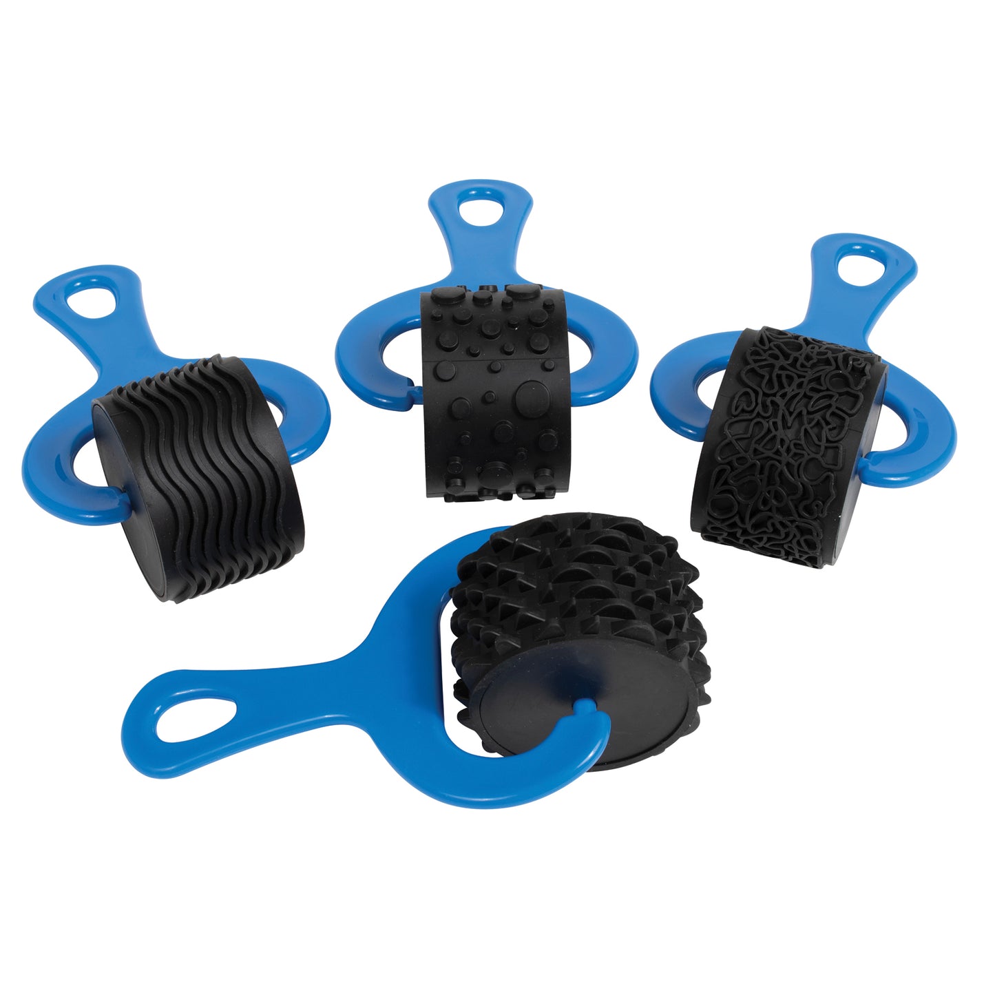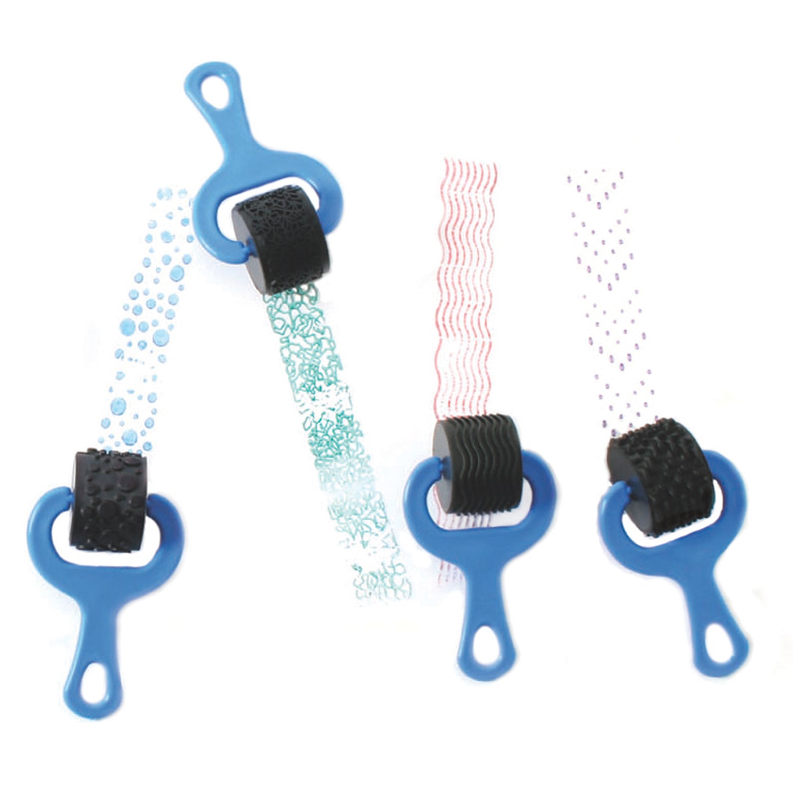 i : 4 DIFFERENT PATTERNS -- Sold as 2 sets, each set includes 4 heavy-duty, textured rollers with different raised patterns: 8 wavy lines; small and large circles; squiggles; and 7 lines of dots, dashes and arcs.