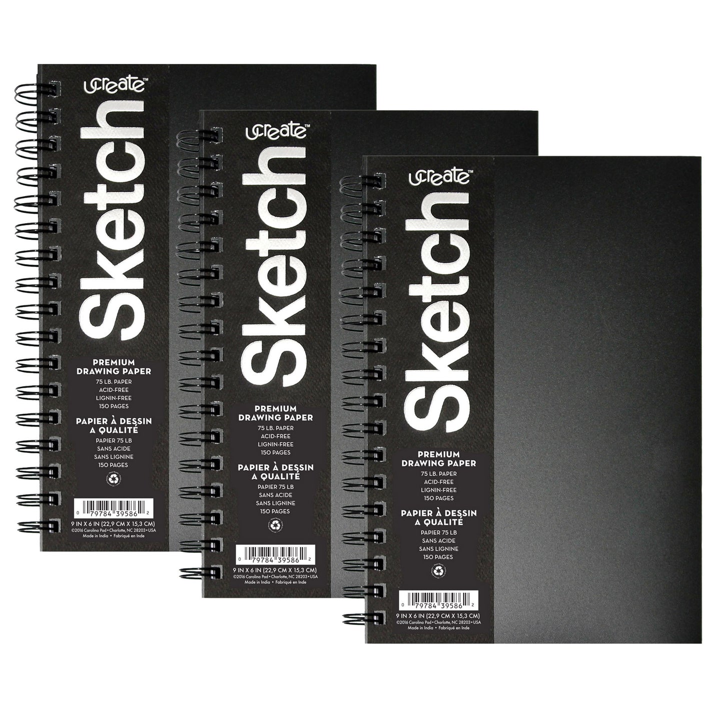 Premium sketch book with a durable black poly cover and back. Each book contains 75 sheets of heavyweight, acid-free drawing paper. The spiral binding lies flat for comfortable drawing and sketching. Ideal for sketching and drawing with dry media. Sheets are perforated for final art. Acid-free. Sold as a pack of 3 books.