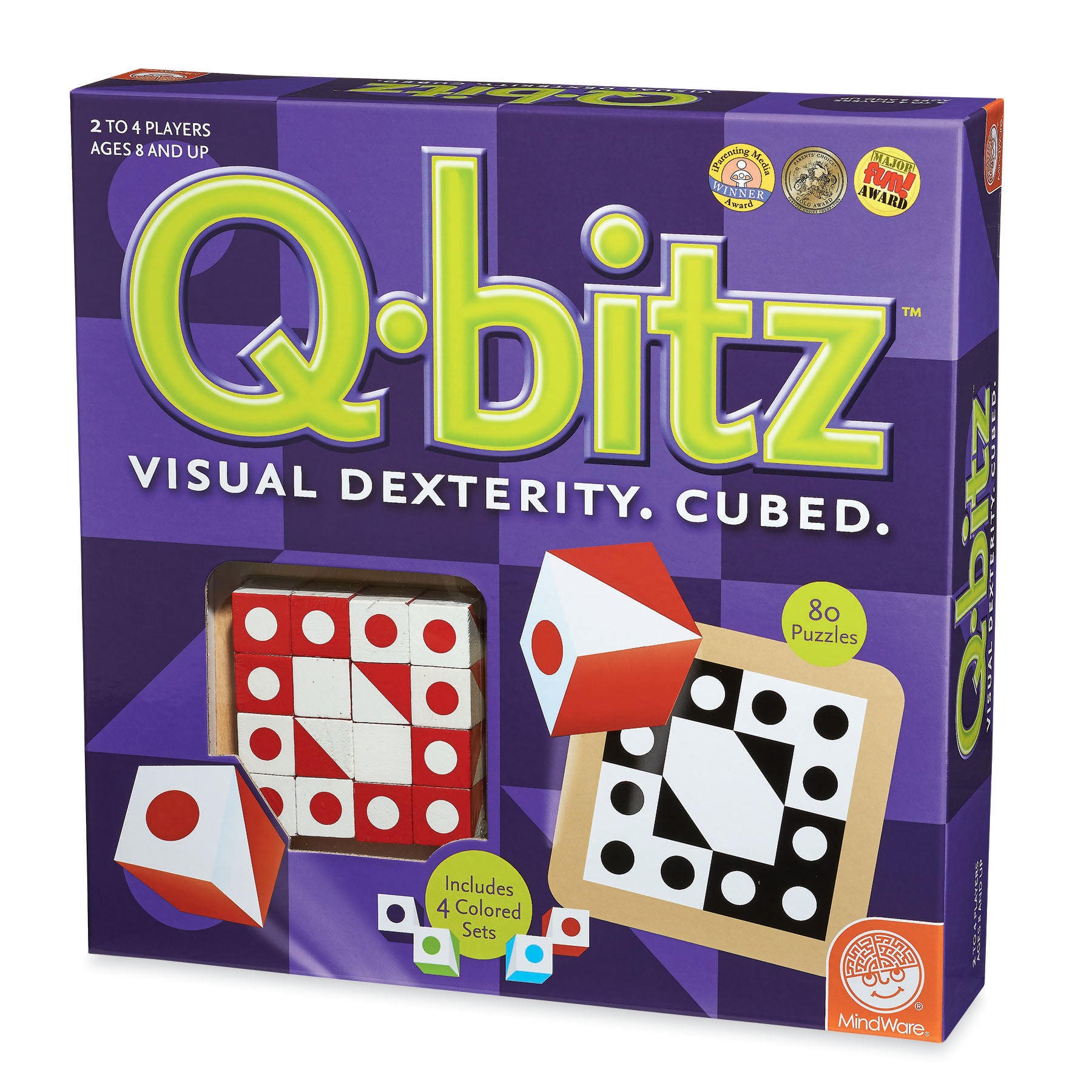 • Includes 80 Q-bitz cards, 4 wooden trays and 4 sets of 16 cubes