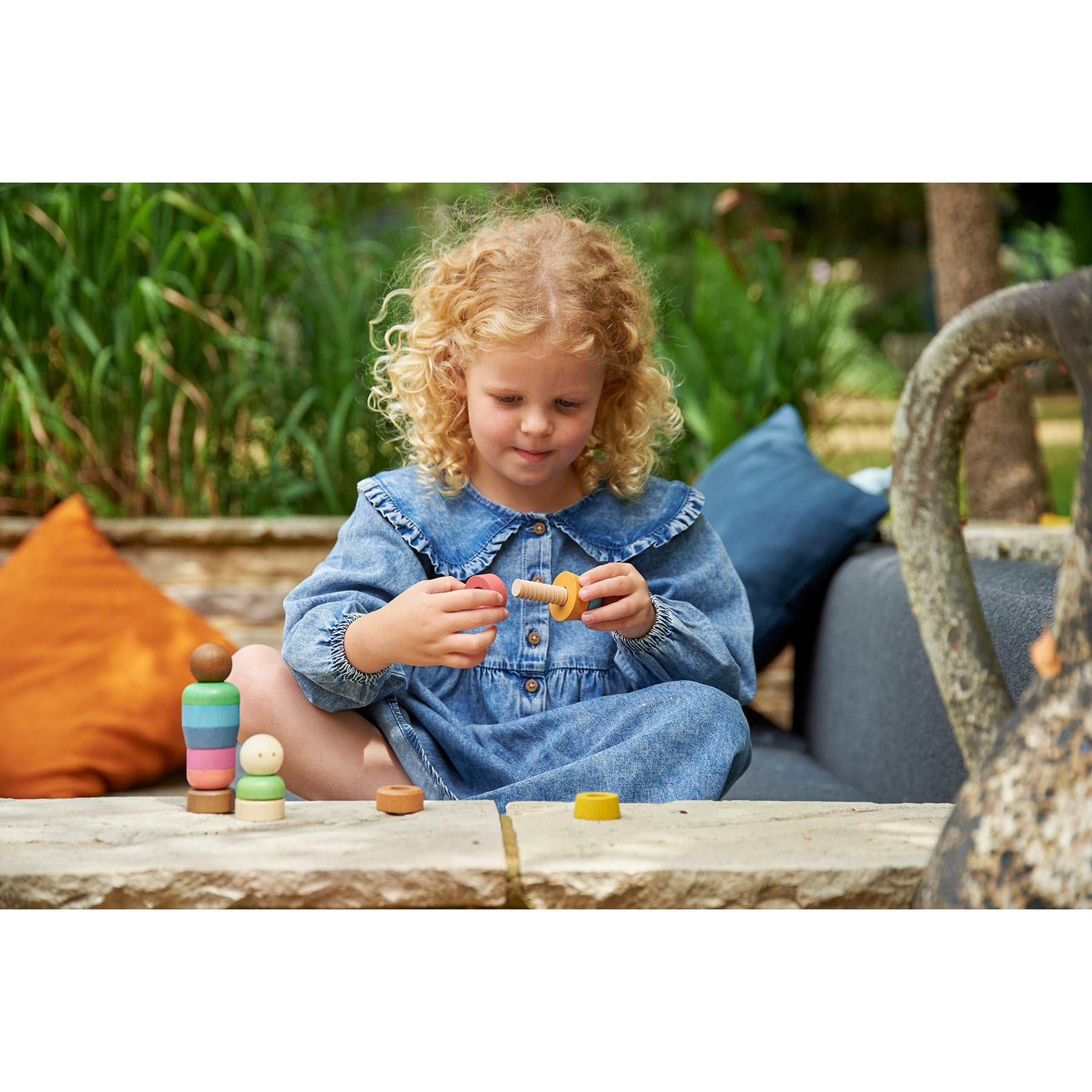 This set includes 15 bolt figures in 5 sizes and skin tones. It also includes 45 nuts in different sizes and 7 colors: red, orange, yellow, green, blue, indigo and purple. Use the "feet" to screw the nuts in place. Children can screw on the pieces to create unique characters of different colors, shapes and sizes. Use this set to open discussions about inclusion and diversity through play. The simple design and various skin tones mean these figures can represent anyone! Use these colorful figures for imaginative play, color recognition and sorting. Children can improve their fine motor and descriptive language skills as they build new figures every time they play. Use these open-ended figures for role or loose parts play. Made from high-quality materials, these figures are designed to last for years of home or classroom use. The chunky wooden design is also the perfect size for little hands. Includes a cotton storage bag. For ages 4+. Includes a storage bag. Size of heads: 1.3" dia. Size of bodies: 2.2"H, 2.8"H, 3.3"H, 3.9"H and 4.5"H.