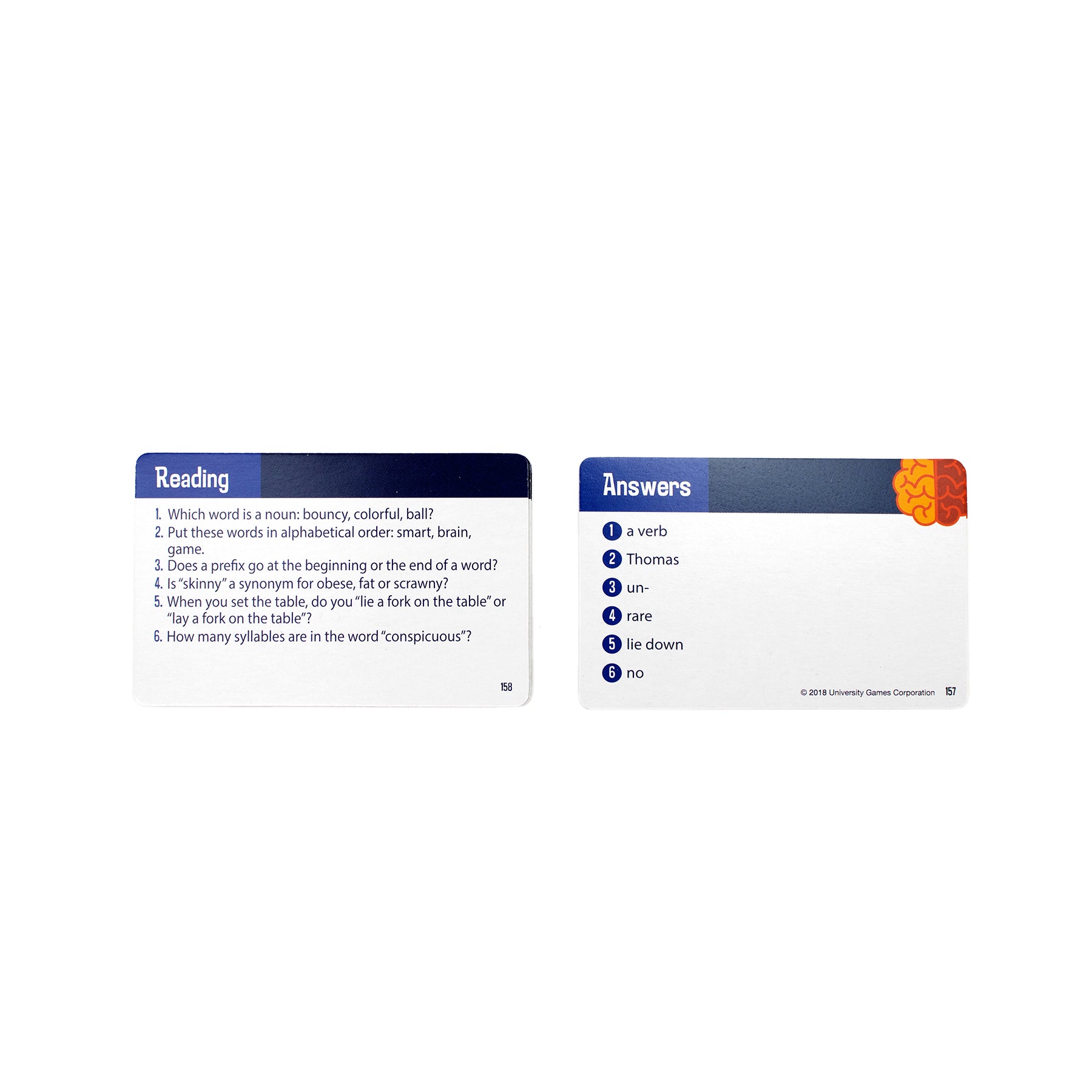 In The Scholastic Brainiac Game, players spin the SMART Spinner, then compete to answer questions in five subject areas: Science, Math, Arts, Reading, and The World. Each Question Card has six different questions tailored to grades 1 to 6, so that players answer questions corresponding to their grade levels. The first player to fill his or her brain with SMART Tokens wins!