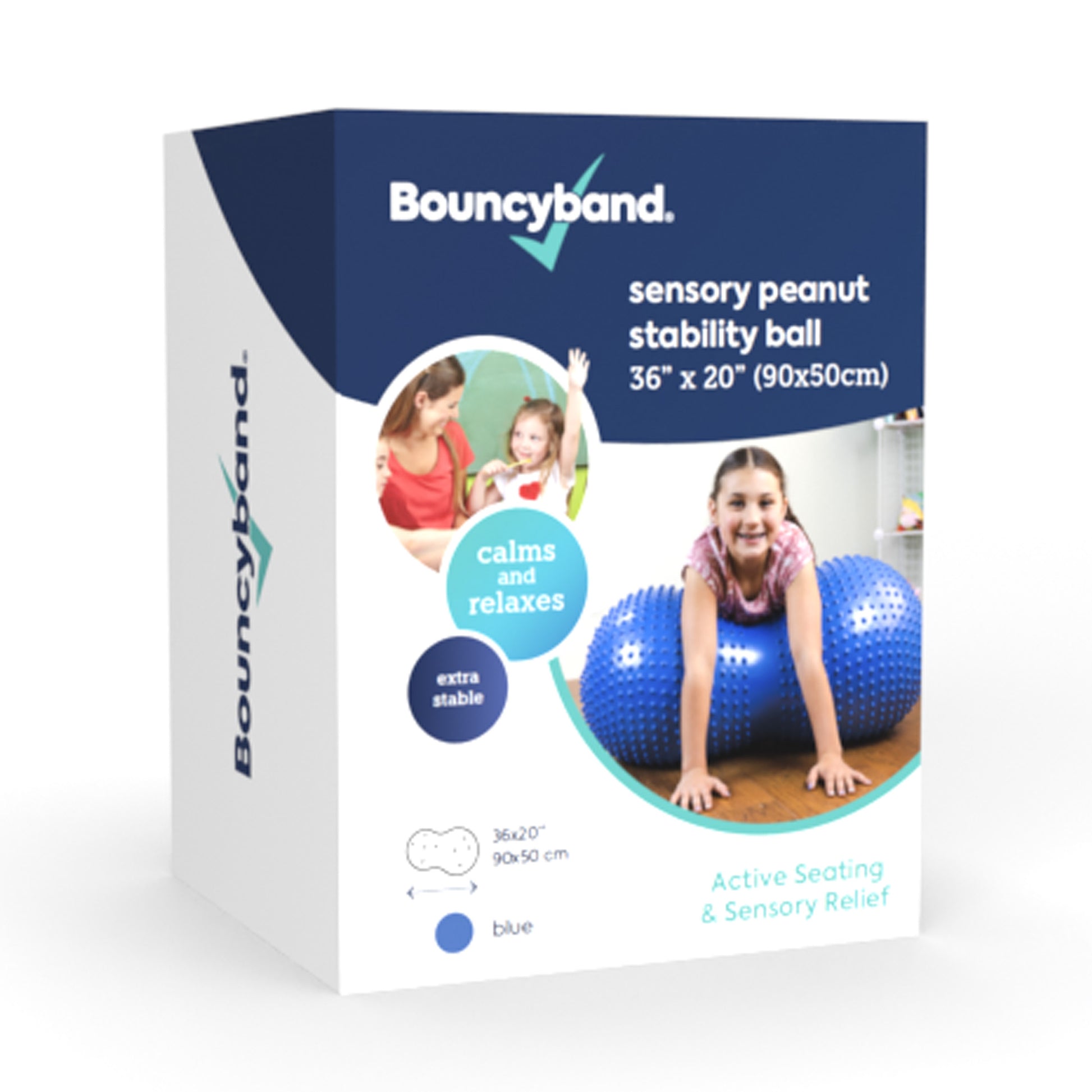 Deep pressure applied when sitting, lying across or leaning on the ball, calms, relaxes and quiets kids giving a sense of security and well-being. Soothing effect relieves anxiety and restlessness and improves concentration and behavior in the classroom and at home. Used as a chair the dipped sitting “saddle” position enables greater stability than a traditional ball chair while developing balance and coordination. Provides sensory comfort and therapeutic support for all kids including those with ADHD, motor delays, autism, and sensory processing disorders. Sitting, bouncing, and rocking front to back and side-to-side strengthens muscles and help develop core strength. Includes pump, 2 stoppers, and a stopper remover. Measures 36" x 20" (91x51cm). Maximum weight of 350 lbs (159 kg).