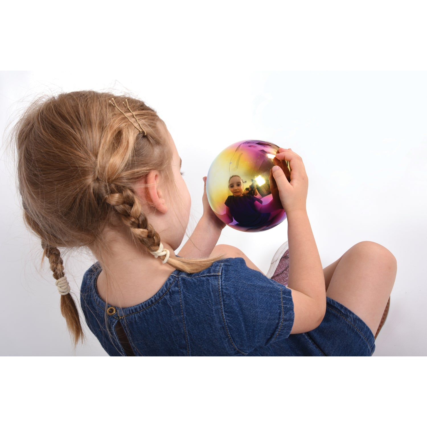 A set of 4 reflective, iridescent balls for multisensory play. The stunning, iridescent surface provides a slightly distorted reflection which fascinates children and encourages descriptive language. The reflective surfaces change color in the light as children manipulate the balls. They are smooth and lightweight for small hands to handle. The balls are chemical-free, non-porous and easy to clean, which makes them ideal for all play environments. Sensory Color Burst Balls are made of durable, tarnish-resistant stainless steel. Sizes: 2.4", 3.2", 3.9" and 5.9" dia. Suitable for all ages.