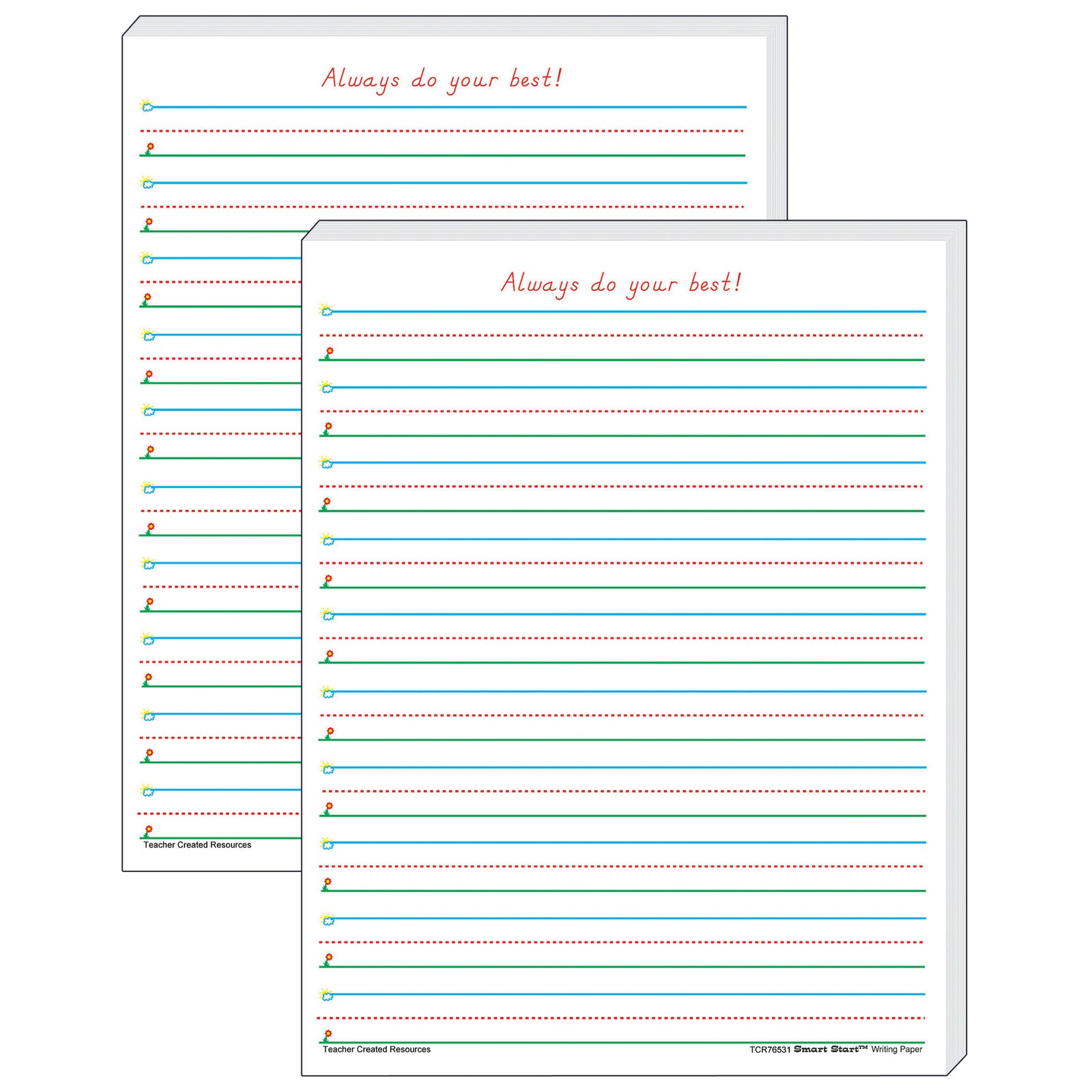 Smart Start Writing Paper (8-1/2" x 11") is truly a "Smart Start" for beginning and experienced writers. Bold graphics in blue, green, and red promote the feeling of success as children simply "Start at the Sky and pull down to the Ground" to form letters correctly. 1-2 Writing Paper lines have 5/8" spacing. Each pack includes 100 sheets. Sold as 2 packs for a total of 200 sheets.