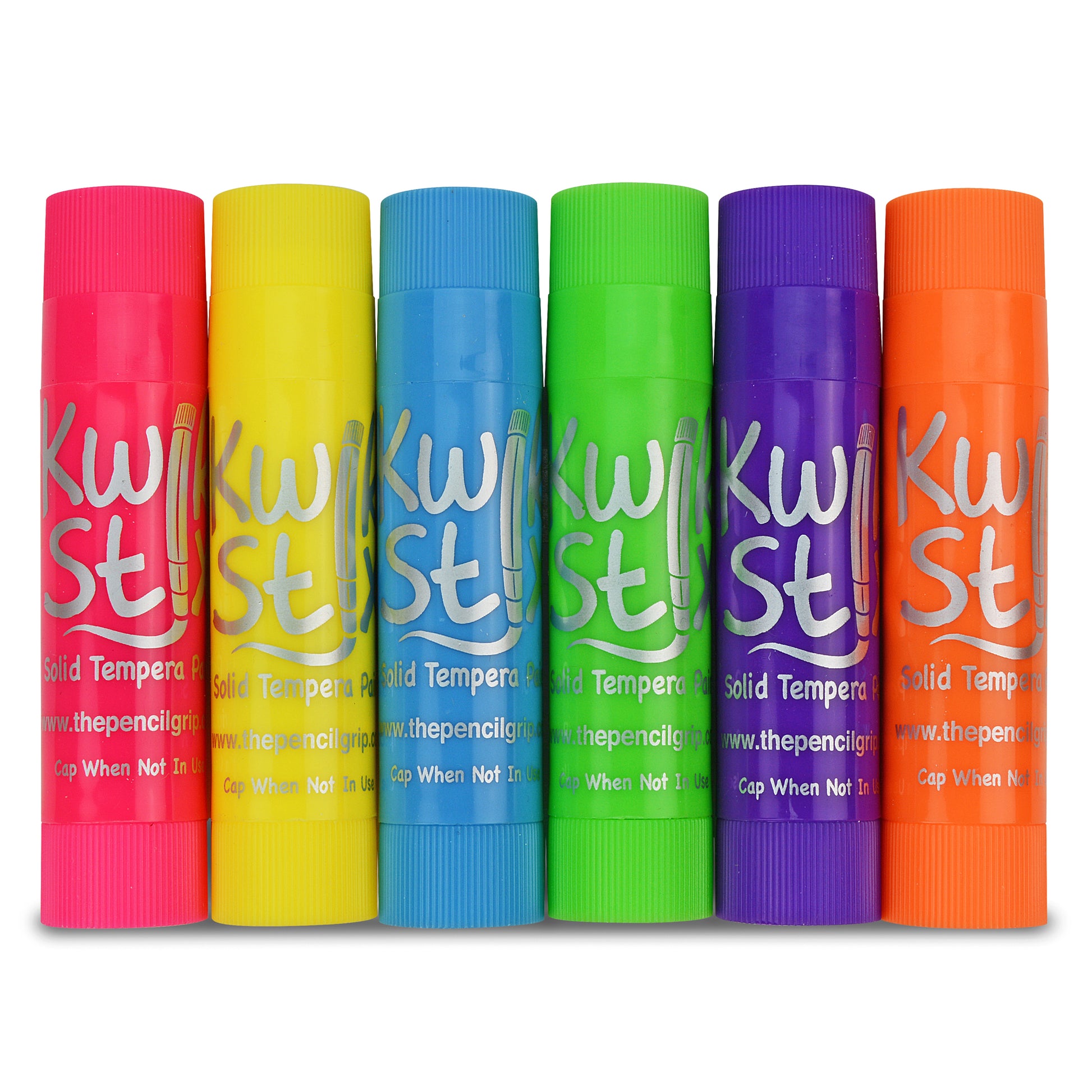 Tired of the endless mess of painting? Fear not! Kwik Stix Solid Tempera Paint sticks take the mess out of painting while keeping all the fun! Simply uncap, twist, and paint! Kwik Stix have a fast drying formula that allow them to dry in 90 seconds while still leaving a paint-like finish! No cups, smocks, water or brushes required. Kwik Stix come in assorted vibrant colors with coverage that won't crack. Great on poster paper, cardboard, wood and canvas. Each pack includes 6 bright neon colors. Sold as 6 packs for a total of 36 Kwik Stix.