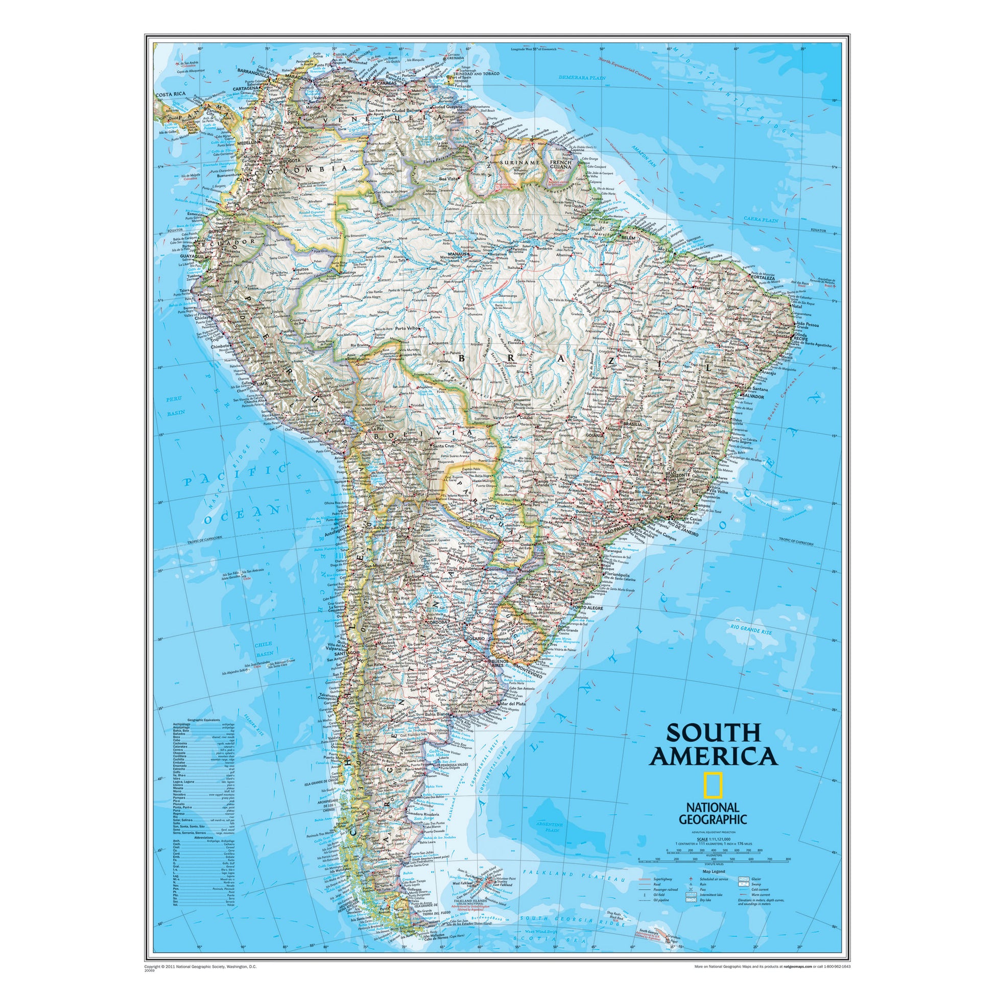This classic map of South America shows political boundaries, place-names, airports, major roads and highways, and other geographic features for the entire continent.
