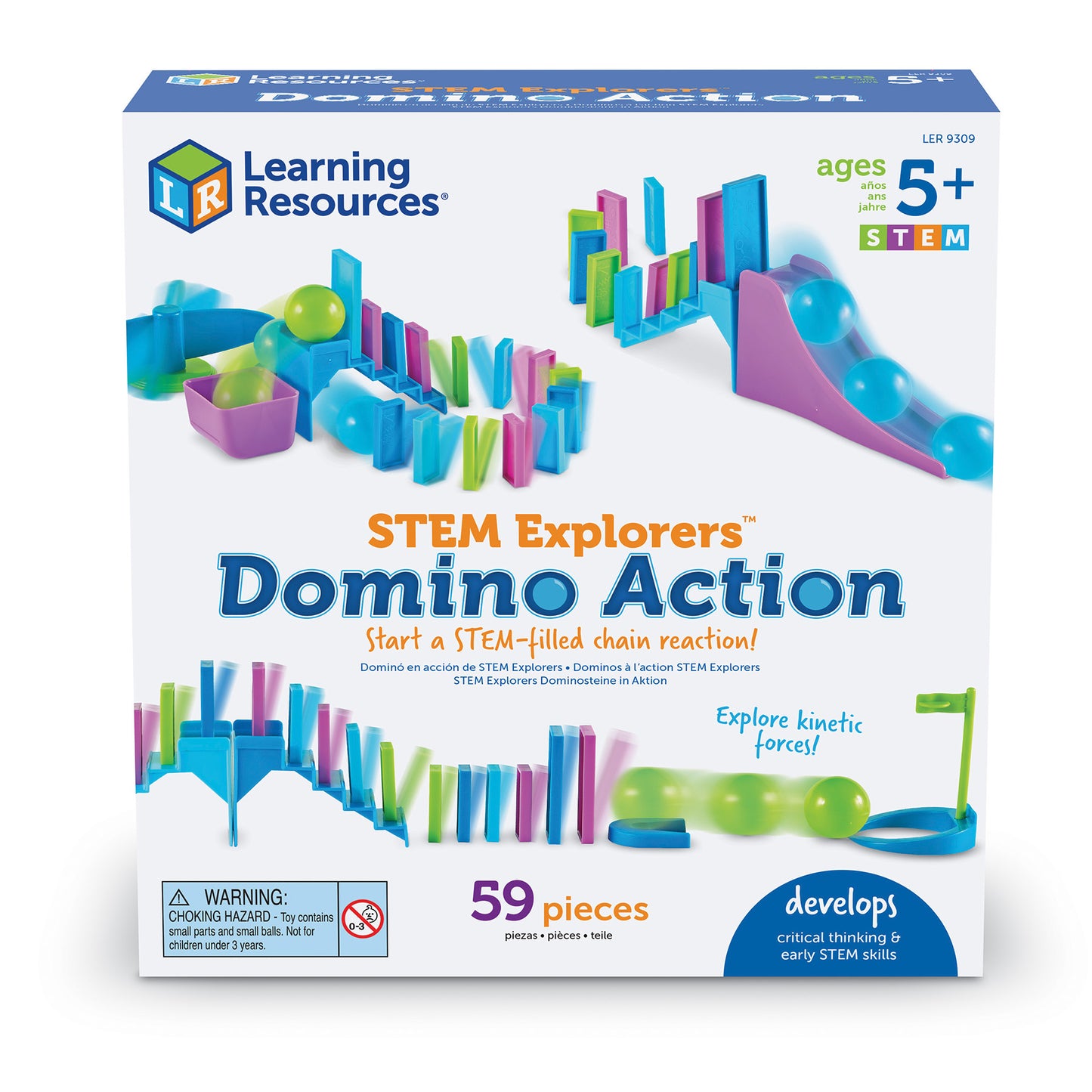 These tumbling, toppling domino runs will make you say "Whoa!"! Kids embark on a domino dash when they craft their own domino runs with STEM Explorers Domino Action, one of the fun STEM toys for kids from Learning Resources. Using the set's 45 colorful dominos, kids build their own obstacle-filled domino runs to solve the included STEM challenges! As they build, test, and tweak their domino runs, kids will also strengthen essential kindergarten STEM skills, including critical thinking, problem solving, and engineering. After they master the progressive STEM challenges in this STEM toy for kids, little learners can even build their own! STEM Explorers Domino Action includes 45 dominos in two sizes, 10 double-sided STEM challenge cards, plus obstacle pieces including a slide, cup, spinning gates, and more. Our fun STEM toys for kids are ready for homeschool or kindergarten classroom use!