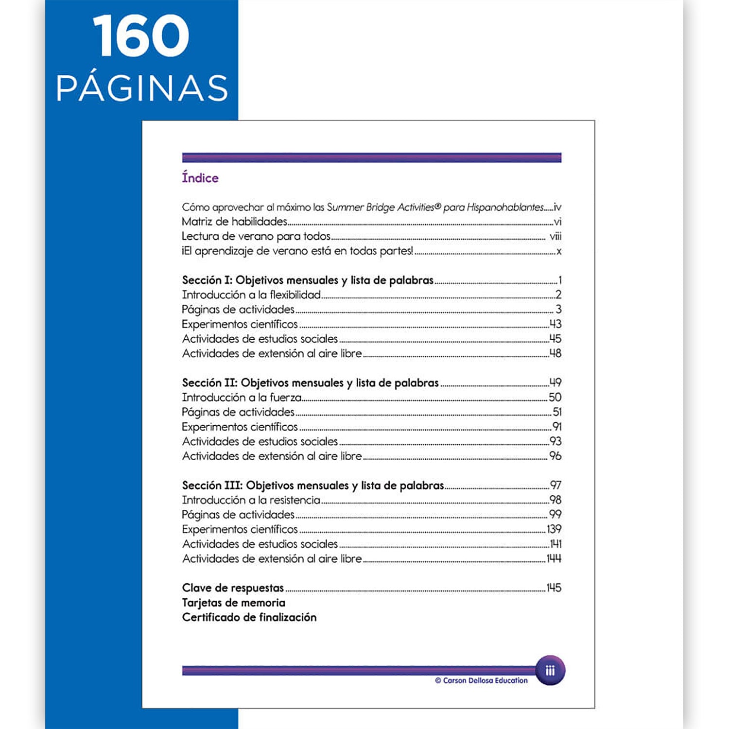 Prevent summer learning loss and prepare your child for back-to-school success in just 15 minutes a day with engaging activities, exercises, fun games, and more – all in one workbook with Summer Bridge Activities Spanish Workbook! This Spanish book helps Spanish-speaking seventh - eighth graders keep their skills sharp while learning English during the summer months to stop summer slide through fun practice pages and activities, covering math, science, reading, writing, social studies, fitness, and more. Students practice grammar, reading passages, graphing, dictionary skills, geometry, science experiments, and other engaging topics, with both activities and directions in Spanish. This Spanish workbook for kids includes flash cards and a completion certificate, and features a skill matrix and answer key to track student progress. Each page is numbered by day so kids and parents can track progress and reach monthly learning goals.