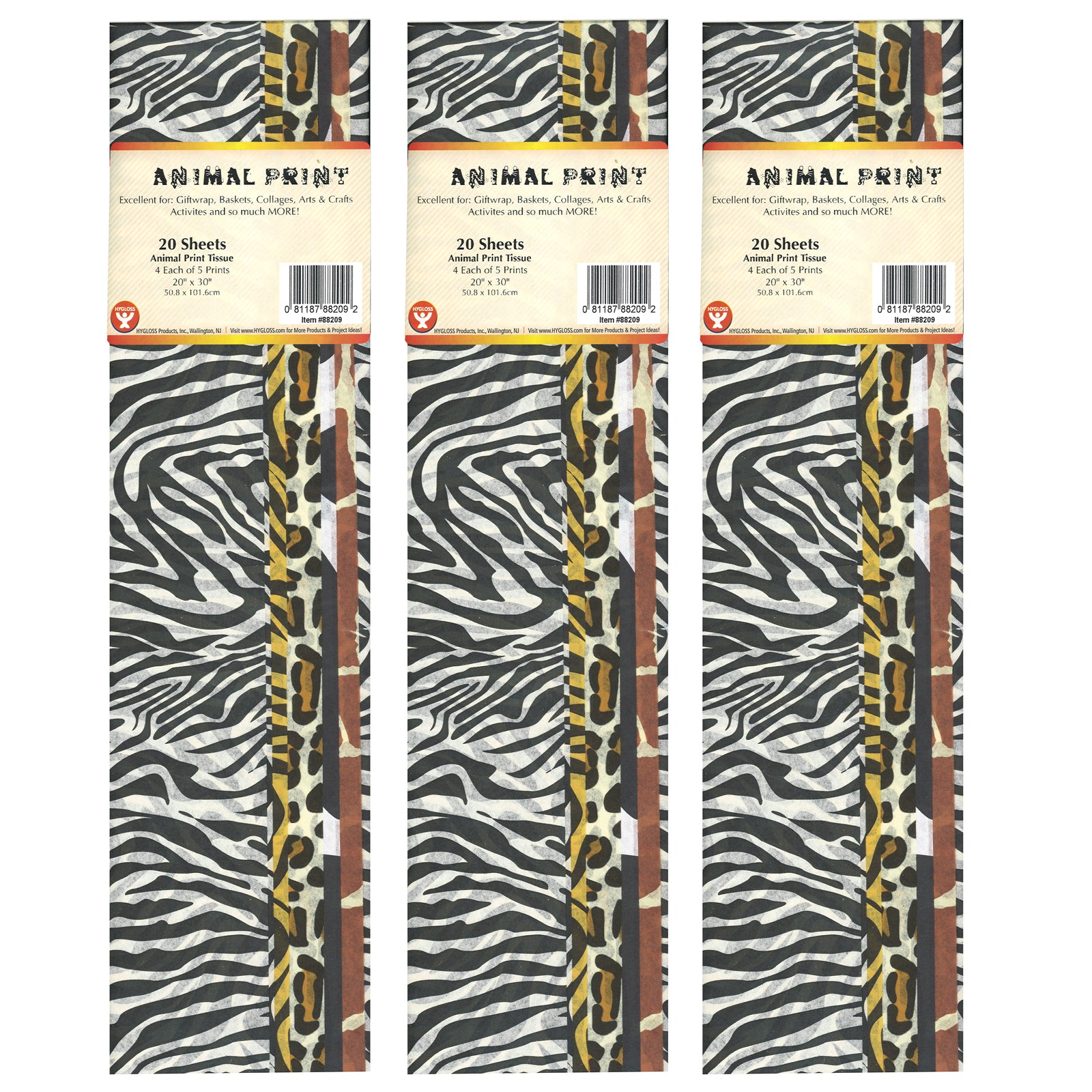 Tissue paper can be used for a multiplicity of fabulous crafts and classroom uses. Perfect for gift packages, decoupage, and other paper crafts, our tissues comes in a variety of bright colors and unique designs. Thanks to the durability of Hygloss' tissue paper you can make tissue paper crafts and teaching tools that will last for years. Use the non-bleeding paper with glue for a clean finish -- colors won't run! Package contains 20 sheets: 4 each of 5 animal skin designs. Sold as 3 packs for a total of 60 sheets.